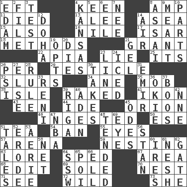 ACROSS 1. Newt 4. Peachy ____! 8. Electrical Unit 11. Passed on 13. Toward shelter 14. Toward the sea 15. In addition 16. Mediterranean tributary 17. Austrian river, tributary to the Danube 18. Modes 21. Monetary aid 22. Capital of Western Samoa 23. Untruth 25. ___ a Wonderful Life 26. For each 29. A testis 32. Runs notes together 34. A saturated hydrocarbon 35. Disorderly crowd 38. Small island 39. Moved through 41. Visual representation of an object 43. Car or cant ending 44. Binary compound 45. Constellation of myth 46. Consumed 50. Compass dir. 51. Beverage made from leaves 54. Forbid 55. Snake ____ (dice throw) 57. Sports stadium 59. Snuggling 63. Old wives' tales, e.g. 64. Moved rapidly 67. Length times width 68. Prepare for publication 69. Not divided or shared with others 70. A home for chicks 71. Perceive with the eye 72. Uncontrolled 73. A female animal or person DOWN 1. Dutch treat 2. Do some clerical work 3. Trial 4. Sunflower state 5. Connecticut Ivy Leaguer 6. Snakelike fish 7. Born 8. Slender Brazilian palm 9. Intended 10. Components 12. Capital of the state of Qatar 14. Wind 19. Chooses 20. Pass on 21. Set 23. Actor's bit 24. On the rocks 26. Air pressure measure (abbr.) 27. Otherwise 28. Governing power 30. Proceeds 31. Arab leader 33. Painter Guido (1575-1642) 36. Migrant worker of the '30s 37. Expressions of contempt or scorn 39. Capital of Latvia 40. An important port of Yemen 42. Compass dir. 45. Lyric poems 47. Basketball assoc. 48. Watched over 49. Sight organ 51. Stories 52. Eat (away) 53. Nest on high 56. Comedian Laurel of Laurel & Hardy 58. Fish or hair follower 60. Angers 61. Tender 62. Yard entry 64. Compass dir. 65. Luau course 66. Pipe bend