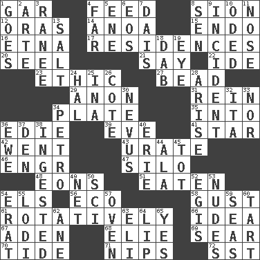 ACROSS 1. Slender fish 4. Nourish 8. The Jewish people; Israel 12. Mouths or openings 14. Small Philippine buffalo 15. Inside; within (prefix) 16. Inactive volcano in Sicily 17. Homes 20. Sew up the eyelids of hawks and falcons 21. Declare 22. Binary compound 23. Moral principle 27. Necklace unit 29. At once, immediately (arch.) 31. It's straight from the horse's mouth 34. Food holder 35. To the inside or interior of 36. Singer Brickell 39. First lady 41. Play the lead 42. Left 43. A salt of uric acid 46. Engineer (abbr.) 47. Grain storage tower 48. Immeasurably long periods of time 51. Ingested 54. Raised railways 56. Environmental prefix 58. Abrupt rush of wind 61. Happening in regular succession 66. The main thing one is thinking about 67. Arabian gulf 68. Writer Wiesel 69. Wither 70. Event that recurs at intervals 71. Pinches, bites 72. Fast jet (abbr.) DOWN 1. Leaves 2. Johnson of "Laugh-In" 3. The wife of a rajah (variant) 4. Distant 5. Compass dir. 6. Greek goddess of the dawn 7. Raised platform 8. Elected rep. 9. Happening 10. Wrote a lyric poem 11. Characteristic smell of wine 13. Table seasoning 18. Small moist lump or mass 19. Sight organ 24. Actor Linden 25. _ tizzy (2 wds.) 26. ____ d'Azur (French Riviera) 28. Ascend 30. Mole, birthmark 32. Call ___ day 33. And not 34. Stone: prefix 36. She-sheep 37. Lair 38. Eaten 40. 4th largest of the Great Lakes 44. In the manner of 45. Small child 49. Fish or hair follower 50. _-fi 52. Armor plate that protects the chest 53. Unclothed pictures 54. Part of Q.E.F. 55. Farming town in central California 57. Baking chamber 59. Oceans 60. Small pie 62. One (Scot) 63. Biblical high priest 64. Mouth edge 65. It is so