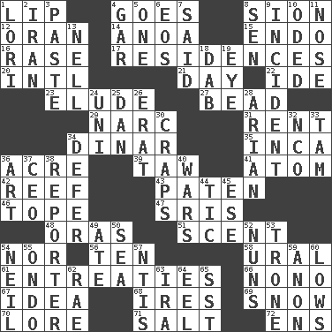 ACROSS 1. Mouth edge 4. Moves 8. The Jewish people; Israel 12. NW Algerian seaport 14. Small Philippine buffalo 15. Inside; within (prefix) 16. Raze (variant) 17. Dwellings 20. International (abbr.) 21. 24 hours 22. Binary compound 23. Evade 27. Necklace unit 29. Drug cop 31. Monthly bill 34. Middle Eastern gold or silver currency 35. South American Indian 36. Land measure 39. The 23rd letter of the Hebrew alphabet 41. Tiny particle 42. Coral collection 43. Eucharist need 46. Drink excessively 47. Indian titles of respect 48. Mouths or openings 51. Aroma 54. Not either 56. Nine, plus one 58. Mountain range 61. Pleas 66. Words to Nanette 67. It may be bright or harebrained 68. Angers 69. Overwhelm 70. Old wives' tales, e.g. 71. Table seasoning 72. Followers of ems DOWN 1. Australian parrot (variant) 2. SW Asia republic 3. Thick mixture 4. Slender fish 5. Single 6. Greek goddess of the dawn 7. Alleged 8. Elected rep. 9. Happening 10. Wrote a lyric poem 11. Characteristic smell of wine 13. 1994 drama film starring Jodie Foster 18. Small moist lump or mass 19. Sight organ 24. University (slang) 25. Daniel's nick name 26. Part of Q.E.F. 28. Believer in; advocate of (suffix) 30. Dice game 32. Non-commissioned officer (abbr.) 33. Scottish cap 34. Postpone 36. Nonscientific branch of learning 37. Corporate head (abbr.) 38. News announcer 40. Armed conflicts 44. Nervous spasm 45. Compass dir. 49. Had dinner 50. Ocean 52. Religious women 53. Marketplace scale 54. Famous astronaut Armstrong 55. Southwest Nigerian state 57. Nuclear Threat Initiatives 59. Soon (poet.) 60. Moos 62. Actress Charlotte 63. Lyricist Gershwin 64. Snakelike fish 65. Fast jet (abbr.)