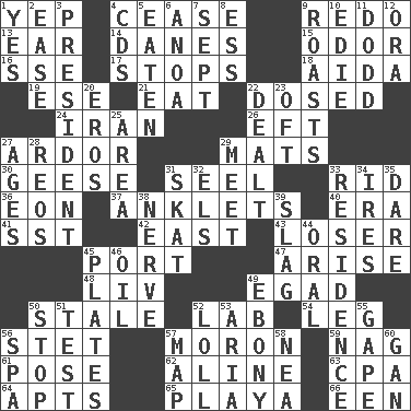 ACROSS 1. Slangy assent 4. Desist 9. Make new 13. Ewer handle 14. Natives or inhabitants of Denmark 15. Scent 16. Compass dir. 17. Discontinues 18. Opera by Verdi 19. Compass dir. 21. Consume 22. Administered medicine 24. SW Asia republic 26. Newt 27. Zeal 29. Floor protectors 30. Honkers 31. Stitch closed the eyes of (a falcon) 33. To free from 36. Age 37. Short socks 40. Epoch 41. Fast jet (abbr.) 42. 90 degrees 43. Failure 45. Sweet dark-red dessert wine 47. Get up 48. 54 in ancient Rome 49. Mild oath 50. Lacking originality or spontaneity 52. Experiment locale 54. Part of a journey 56. Proofreading order 57. Person of subnormal intelligence 59. Tired old horse 61. Introduce or present, as a question 62. Place in a line 63. Tax preparer (abbr.) 64. Flats, for short 65. Beach, in Buenos Aires 66. Car or cant ending DOWN 1. Affirmative reply 2. Relaxation 3. Elected leader of a country 4. Music discs 5. Consumed 6. Small Philippine buffalo 7. Back-to-school mo. 8. Double-curved letter 9. Exposes to great heat 10. Singer Brickell 11. Texas town _ City 12. Mouth or opening 20. Greek god of love 22. Started a card game 23. Often (poetically) 25. Length times width 27. Grows older 28. Vintage cars 29. Rendezvous 31. Three-handed card game 32. Raised railways 33. Home 34. Angers 35. Have the gumption 38. Effrontery 39. Volcanic refuse 44. Spoken 45. Food holders 46. Petroleum 49. Black 50. Constrict 51. Trial 52. Hang loosely or laxly 53. Roberta Peters solo 55. Stare wonderingly 56. Health resort 57. Atlas unit 58. Teachers' org. 60. Separate the seeds from cotton