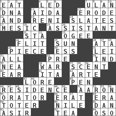 ACROSS 1. Consume 4. Directed 7. ____ Bator, Mongolia 11. Heredity factor (abbr.) 12. Opera by Verdi 13. Eat (away) 14. Added to 15. Painter Guido (1575-1642) 16. Chalkboards 17. Of or pertaining to a meson 19. Helper 21. R.R. building 23. Double curve, resembling the letter S 24. Sudden quick movement 25. Player for Phoenix 26. "One Day ___ Time" 29. Part 30. Double-curved letter 31. Luau accessory 32. Everything 33. Before (prefix) 34. Working for oneself (abbr.) 35. Teachers' org. 36. Armed conflict 37. Odor 40. Hearing organ 41. Call ___ day 42. Johnson of "Laugh-In" 43. Old wives' tales, e.g. 45. Fenced enclosure 46. Dwelling 51. Composer Copland 55. Speaker 56. Part of Q.E.F. 58. Epoch 59. Carrier 60. Mediterranean tributary 61. Daniel's nick name 62. SW Saudi Arabia district 63. Afternoon social gathering 64. Bear (Spanish) DOWN 1. Dutch treat 2. Singer Murray 3. Small boys 4. Untruth 5. Pulitzer Prize-winning author Ferber 6. Raised platform 7. A salt of uric acid 8. Globular water bottle used in Asia 9. Arabian gulf 10. A home for chicks 12. Northern region 13. Otherwise 16. Attaches a signature 18. Capri or Wight 20. Lush 22. Had dinner 24. Having threads 25. Father Junipero _ 26. Place in a line 27. Portable shelter 28. Help 29. Entreaty 32. One (Scot) 33. Eucharist need 36. One who wires 37. Plant excrement 38. Cause to be 39. Inactive volcano in Sicily 43. 61 cubic inches 44. Aroma 46. Round or rotation of duties 47. Greek god of love 48. Suttee (variant) 49. Penny 50. One of the Great Lakes 52. Make new 53. Mouths or openings 54. Billionth: prefix 57. Wing