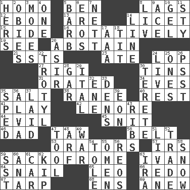 ACROSS 1. Same (prefix) 5. Benjamin's nick name 8. Fails to keep up a pace 12. Inky black, to poets 13. "We ___ not amused" (Victoria) 14. It is permitted: Lat. 15. Travel on or in a vehicle 16. Producing rotation 19. Perceive with the eye 20. Choose not to consume 21. Fast planes 23. Had dinner 24. Chop off 27. Swiss mountan, "Queen of the Mountains" 30. Canisters 31. Spoke pompously 34. Nights before holidays 35. Table seasoning 38. Indian princess (variant) 40. Repose 41. Frolic 42. Poe poem 44. Morally bad or wrong 45. In a ____ (agitated or irritated) 46. Male parent 47. The 23rd letter of the Hebrew alphabet 50. Waist strap 53. Speakers 57. Big collection agency 59. Italian handbag shop? 63. "Terrible" tsar 64. Slow-paced one 65. Lion 66. Redecorate 67. Canvas cover 68. Followers of ems 69. Afresh DOWN 1. Possessive pronoun 2. Off-Broadway awards 3. Methods 4. Single 5. Sharp remark 6. Greek god of love 7. Remaining after all deductions 8. 54 in ancient Rome 9. Adept person 10. Set 11. Filthy place 14. Actor's bit 17. Auto club (abbr.) 18. Teat (slang) 20. SW Saudi Arabia district 22. TNT 24. Not recorded 25. Singles 26. Inconspicuous attention getter 28. Slender fish 29. Slanted text style (abbr.) 30. Cylindrical with tapered ends 32. Compass dir. 33. Cub Scout units 35. Drove too fast 36. Inventor's middle name 37. Put down 39. Period of immesurable duration 43. Chest bones 47. Utensil 48. Sandy's bark 49. Armed conflict 51. Make or become more lively 52. Swap 54. Lacquered or enameled metalware 55. Sign of something about to happen 56. Vintage cars 58. Frozen precipitation 59. Fast jet (abbr.) 60. Santa ___, CA 61. Auto 62. Sleep 63. Retirement account (abbr.)
