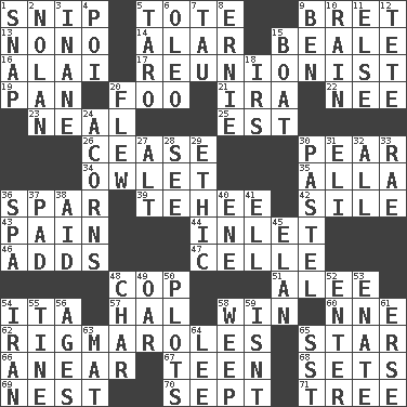 ACROSS 1. Clip 5. Lug 9. Cy Young winner Saberhagen 13. Words to Nanette 14. Having or resembling wings 15. Memphis, Tenn. Street 16. Mountain range southwest of Kyrgyzstan 17. One who advocates reunion 19. Baking dish 20. Egg _ yung 21. Lyricist Gershwin 22. Born 23. Actress Patricia 25. Eastern Standard Time (abbr.) 26. Stop 30. Lightbulb-shaped fruit 34. A small or young owl 35. Silent film actress Nazimova 36. Practice fight 39. Giggle 42. Filth; sediment 43. Ache 44. An arm off of a larger body of water 46. Sums up 47. Cell (Danish) 48. Police officer (slang) 51. Toward shelter 54. Call ___ day 57. Actor Linden 58. Acquire through effort 60. Compass dir. 62. Complicated, petty procedures 65. Play the lead 66. Approach 67. Adolescent 68. Puts into a specified state 69. A home for chicks 70. Back-to-school mo. 71. Family _ (genealogy) DOWN 1. Fastener 2. Pitcher Ryan 3. Empty; void 4. Luau course 5. Pacific island yam 6. Butter sub 7. The 19th letter of the Greek alphabet 8. Bert's buddy 9. Benjamin's nick name 10. Precipitation 11. Otherwise 12. Wig 15. Water vessel 18. Big collection agency 20. Soared 24. Oak nuts 27. Keyboard modifier key 28. Perceive with the eye 29. Moral principle 30. Soft color 31. Connecticut Ivy Leaguer 32. 100% 33. Actress Charlotte 36. Health resort 37. Groovy apt. 38. Assist 40. Compass dir. 41. Pipe bend 45. Flair 48. Burn to charcoal 49. Rowing implement 50. Schemes 52. Keyboard key 53. Related on the mother's side 54. SW Asia republic 55. Prong on a fork 56. Matures 58. Shed a tear 59. Is not 61. Celtic language 63. Floor covering 64. Area sheltered from the wind 65. Fast jet (abbr.)