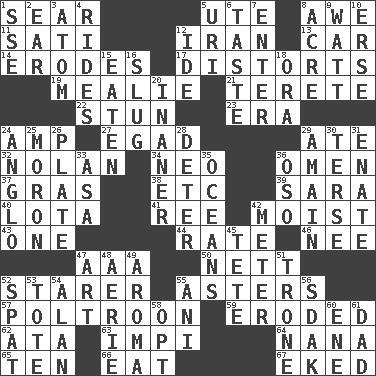 ACROSS 1. Shrivel 5. Shoshoni 8. Deep reverence 11. Suttee (variant) 12. SW Asia republic 13. Automobile 14. Eats (away) 17. What propaganda does 19. Ear of corn 21. Cylindrical with tapered ends 22. Make senseless or dizzy 23. Epoch 24. Electrical Unit 27. Mild oath 29. Had dinner 32. Pitcher Ryan 34. Modern: prefix 36. Sign of things to come 37. Pate de foie ____ 38. And so on (abbr.) 39. "Two Mules for Sister ____" 40. Globular water bottle used in Asia 41. Portuguese money of account (variant) 42. Damp 43. Single 44. Assign a rank or rating to 46. Born 47. American Automobile Association (abbr.) 50. Remaining after all deductions 52. A viewer who gazes fixedly 55. Michaelmas daisies 57. Characterized by complete cowardliness 59. Eaten away 62. "One Day ___ Time" 63. Body of Kaffir warriors 64. Grandmother 65. Nine, plus one 66. Ingest 67. Supplemented with great effort DOWN 1. Compass dir. 2. Ewer handle 3. Tiny particle 4. Amusement-park features 5. RI univ. 6. Clothes sense 7. Keyboard key 8. 1/640 square mile 9. Electrical Unit 10. Celtic language 12. Binary compound 15. Ingested 16. Snaillike creature with no shell 18. Mouth or opening 20. Sillier 24. White American of non-Hispanic descent 25. Person of subnormal intelligence 26. Food holder 28. Prevent from occurring 29. At full speed 30. Laconic 31. Related on the mother's side 33. White ___ sheet 35. Seas 36. Bear (Spanish) 42. Distance measurement 45. False hair 47. Nonscientific branch of learning 48. Nest on high 49. Odor 51. Heavy duty weighing machine 52. Argument over a trivial matter 53. Haul 54. ____ Jay Lerner 55. Black tropical American cuckoo 56. Neighbor of Neb. 58. Elect 60. Compass dir. 61. Male parent