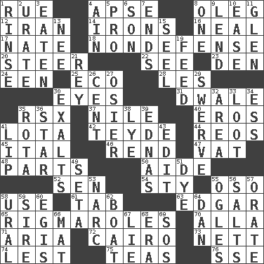 ACROSS 1. Regret 4. Domed church section 8. Cassini of fashion 12. SW Asia republic 14. Removes the wrinkles 16. Anneal 17. Nathan's nickname 18. Unrelated to defense, as in spending 20. Bull 22. Observe 23. Lair 24. Car or cant ending 25. Environmental prefix 28. French article 30. Sight organs 31. A sleeping potion; an opiate (poet.) 35. Acura sports coupe 37. "Death on the ____" 40. Greek god of love 41. Globular water bottle used in Asia 42. Miss Universe 1986, Barbara Palacios _ 44. Vintage cars 45. Slanted text style (abbr.) 46. Tear apart 47. Large container 48. Components 50. Helper 52. Elected rep. 54. Filthy place 55. Bear (Spanish) 58. Purpose 61. Bar bill 63. _ Allan Poe 65. Frustrating wastes of time 70. Silent film actress Nazimova 71. Roberta Peters solo 72. Capital of Egypt 73. Remaining after all deductions 74. For fear that 75. Beverages made from leaves 76. Compass dir. DOWN 1. Remove soap 2. A salt of uric acid 3. Ingested 4. The 18th letter of the Arabic alphabet 5. Adept person 6. Male offspring 7. Extremities 8. Single 9. Grant temporary use of 10. Comfort 11. Small, secluded valley 13. Born 15. Stitch closed the eyes of (a falcon) 19. Nourish 21. Marina Del _, California 26. Penny 27. Flexible twig of a willow tree 29. Turn aside suddenly 30. Glorifies 32. Type of rug 33. Spoils 34. Double-curved letter 35. Roll call or roster of names 36. Play the lead 38. Sodium hydroxide 39. Ferber et al. 41. Mouth edge 43. Prepare for publication 49. Stalk of a moss capsule 51. Color 53. Drug cop 55. Stares 56. Table seasonings 57. Speak pompously 58. Mountain range 59. Male parent of an animal 60. Armor plate that protects the chest 62. Water vessel 64. One of the 12 tribes of Israel 66. Floor protector 67. Falsehood 68. Period 69. Distress signal