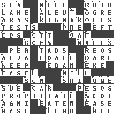 ACROSS 1. Ocean 4. Not ill 8. Writer of Portnoy's Complaint (1969) 12. Unable to walk 14. Native American of Southwest Alaska 16. Legendary monster 17. Ancient river in northeast Turkey 18. Frustrating wastes of time 20. Trials 22. Before (prefix) 23. Bank Draft (abbr.) 24. Begley and Asner 25. Baseball player Mel 28. Clumsy lout 30. Moves 31. Shopping centers 35. For each 37. Small boys 40. Vintage cars 41. Inventor's middle name 42. Peak District village in England 44. Have the gumption 45. Shed a tear 46. Dutch treat 47. Make supply last 48. Artist's stand 50. Place where flour is made 52. Male offspring 54. Indian title of respect (Mr.) 55. Single 58. Institute legal proceedings 61. Automobile 63. Mexican monetary units 65. Appease 70. Native of Scotland 71. Hindu god of fire 72. Consumed 73. Relaxation 74. To erase 75. Grant temporary use of 76. Portuguese money of account (variant) DOWN 1. Chalkboard 2. Having ears or earlike features 3. Collect or gather 4. Armed conflict 5. Biblical high priest 6. Part of a journey 7. Mass 8. Friend of Pooh 9. Stare 10. Not kosher 11. Behest 13. Eastern Standard Time (abbr.) 15. Pacific island yam 19. 480, 500 or 516 sheets of paper 21. "Barney Miller" actor Jack 26. False hair 27. Sadhe (variant) 29. Burden 30. Raisin fruits 32. Path through which fluid escapes 33. Old wives' tales, e.g. 34. Compass dir. 35. Entreaty 36. Nights before holidays 38. Male parent 39. Shuts with force 41. Deep reverence 43. Arab leader 49. Locales 51. Mouth edge 53. Nathan's nickname 55. Witty Wilde 56. Trap for birds or small mammals 57. First name in cosmetics 58. Coast Guard woman 59. Capital and largest city of Mongolia 60. Immeasurably long periods of time 62. Monetary unit of Yemen 64. Compass dir. 66. Sliced dessert 67. Had dinner 68. "___ Little Indians" 69. Conclusion