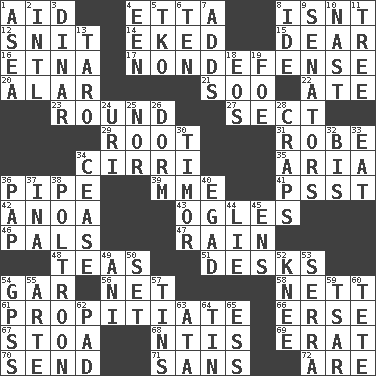 ACROSS 1. Help 4. Singer James 8. Is not 12. In a ____ (agitated or irritated) 14. Supplemented with great effort 15. Letter starter 16. Inactive volcano in Sicily 17. Unrelated to defense, as in spending 20. Having or resembling wings 21. "Barney Miller" actor Jack 22. Had dinner 23. Unit of ammunition 27. Religious group 29. Carrot, for example 31. Loose flowing garment 34. High-altitude cloud 35. Operatic vocal solo 36. Corncob 39. Madame (abbr.) 41. Inconspicuous attention getter 42. Small Philippine buffalo 43. Stares 46. Friends 47. Precipitation 48. Beverages made from leaves 51. Writing tables 54. Slender fish 56. Fish or hair follower 58. Remaining after all deductions 61. Appease 66. Celtic language 67. Portico 68. Nuclear Threat Initiatives 69. Part of Q.E.F. 70. Transmit 71. Without 72. "We ___ not amused" (Victoria) DOWN 1. At sea 2. International (abbr.) 3. Middle Eastern gold or silver currency 4. Car or cant ending 5. Ring climax 6. "___ Little Indians" 7. Sums up 8. Binary compound 9. Legislators 10. Political cartoonist Thomas 11. Relationship diagram 13. Edible starchy tuberous root 18. Greek goddess of the dawn 19. Enemy 24. RI univ. 25. Not either 26. Dormintory (informal) 28. Dice game 30. Southeast Indonesia island 32. Twice 33. Ingest 34. Stop 36. Infant food 37. _ tizzy (2 wds.) 38. Characterized by complete cowardliness 40. Mild oath 44. Falsehood 45. Followers of ems 49. Black tropical American cuckoo 50. Put into a specified state 52. Leg joint 53. Spanish missionary in California 54. Global Positioning Systems (abbr.) 55. Johnson of "Laugh-In" 57. Airtight sealed metal containers 59. Russian ruler of old 60. False hair 62. Writing tablet 63. "One Day ___ Time" 64. Shallow baking pan 65. Curvy letter