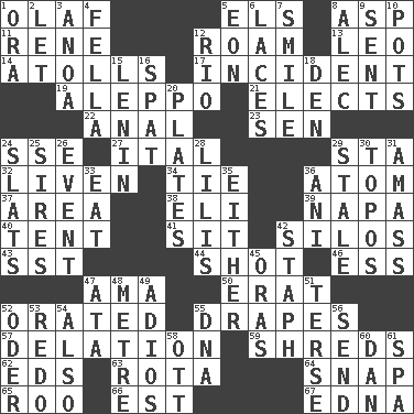 ACROSS 1. Norwegian king 5. Raised railways 8. Cleo's killer 11. French philosopher Descartes 12. Wander aimlessly 13. Lion 14. Ringlike coral islands and reefs 17. Event 19. City in Syria 21. Chooses 22. Of or related to the anus 23. Elected rep. 24. Compass dir. 27. Slanted text style (abbr.) 29. R.R. building 32. Make or become more lively 34. Standoff 36. Smallest unit of an element 37. Type of rug 38. Biblical high priest 39. California wine valley 40. Portable shelter 41. Be seated 42. Grain storage towers 43. Fast jet (abbr.) 44. Opportunity 46. Double-curved letter 47. Nanny (var.) 50. Part of Q.E.F. 52. Spoke pompously 55. Window treatments 57. Accusation by an informer 59. Fragments 62. Begley and Asner 63. Round or rotation of duties 64. Fastener 65. Friend of Pooh 66. Eastern Standard Time (abbr.) 67. Pulitzer Prize-winning author Ferber DOWN 1. Mouth or opening 2. Allow 3. Small Philippine buffalo 4. Man or boy (slang) 5. Age 6. Shoestrings 7. Grin 8. Actor Baldwin 9. Emitted 10. Cooking vessels 12. River (Sp.) 15. Soviet premier 1918-24 16. Argument over a trivial matter 18. Lair 20. Food holders 24. Narrow boards 25. Founders of families 26. Happening 28. Ms. Damita and namesakes 29. Lacking originality or spontaneity 30. Literary convention 31. Collect or gather 33. Consume 35. One or the other 36. Black tropical American cuckoo 42. Staphylococcus 45. Mouths or openings 47. "One Day ___ Time" 48. Distance measurement (Brit.) 49. Goodbye (Sp.) 51. Laconic 52. River in Europe 53. Redecorate 54. In addition 55. Heredity factor (abbr.) 56. Transmit 58. Baseball player Mel 60. One of the 12 tribes of Israel 61. Health resort