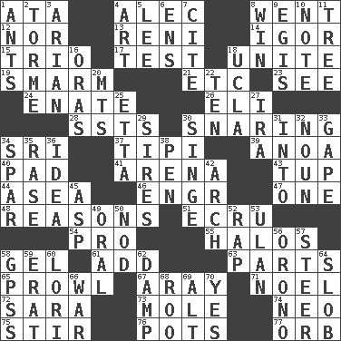 ACROSS 1. _ moment's notice (2 wds.) 4. Actor Baldwin 8. Gone 12. Or not 13. Painter Guido (1575-1642) 14. Russian composer Stravinsky 15. Musical group of three 17. Trial 18. Join together 19. Excessive but superficial compliments 21. And so on (abbr.) 23. Perceive with the eye 24. Maternal 26. Biblical high priest 28. Fast planes 30. Catching in a trap 34. _ Lanka 37. Native american tent (variation) 39. Small Philippine buffalo 40. Groovy apt. 41. Sports stadium 43. Uncastrated adult male sheep 44. Toward the sea 46. Engineer (abbr.) 47. Single 48. Thinks logically 51. Shade of tan 54. Adept person 55. Saint headwear 58. Set 61. Increase 63. Actors' quests 65. Move like a hungry wolf 67. Like ___ of sunshine 71. Christmas carol 72. "Two Mules for Sister ____" 73. Undercover agent 74. Modern: prefix 75. Move through with a circular motion 76. Plant holders 77. Globe DOWN 1. Pismires 2. Singer Mel 3. Believer in; advocate of (suffix) 4. Tate display 5. Area sheltered from the wind 6. Followers of ems 7. Quote 8. Acquire through effort 9. The front part of a cuirass 10. Observe 11. Relationship diagram 16. Mouths or openings 18. Southern CA. univ. 20. Mountains (abbr.) 22. Nine, plus one 25. Singer James 27. Retirement account (abbr.) 29. Fathers 30. Burn superficially 31. To the inside or interior of 32. Part of speech 33. Yawn 34. Coast Guard woman 35. To erase 36. It may be bright or harebrained 38. Animal enclosure 42. Bowlike part 45. Cleo's killer 49. Taken by mouth 50. Dreamland 52. Hit sharply and swiftly 53. ____ Bator, Mongolia 56. U. of Maine site 57. Bull 58. Global Positioning Systems (abbr.) 59. Part of Q.E.F. 60. Australian parrot (variant) 62. Moist 64. Oscar Madison type 66. Armed conflict 68. Friend of Pooh 69. Keyboard modifier key 70. Affirmative reply