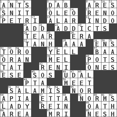 ACROSS 1. Pismires 5. Small moist lump or mass 8. Ancient Greek god of war 12. In a ____ (agitated or irritated) 13. Butter sub 15. Former U.S. Attorney General Janet 16. _ dish (used to culture cells) 18. Having or resembling wings 19. _ china 20. Say or write further 22. Inveterate users 24. Pull into pieces 26. Epoch 27. Hyperbolic tangent 28. American Automobile Association (abbr.) 29. Followers of ems 32. "Corrida" creature 35. Shout 37. Sound made by sheep 38. NW Algerian seaport 39. Cartoonist voice _ Blanc 40. Plant holders 41. Make lace 42. Painter Guido (1575-1642) 43. Washington bills 44. Compass dir. 45. Mayday 46. Freehold land 49. Parent Teacher Assoc. 50. Confront 51. Deli grouping 55. Not either 56. Capital of Western Samoa 57. Singer James 59. Typical models 63. Kenny Rogers chart-topper in '80 64. It's straight from the horse's mouth 65. Pledge 66. Type of rug 67. Medical imaging device (abbr.) 68. Soft DOWN 1. Viper 2. Compass dir. 3. Teat (slang) 4. Ski resort town in Vermont 5. ___ good deed 6. Silent film actress Nazimova 7. Necklace unit 8. N. Chile seaport 9. Monthly bill 10. Extremities 11. "Barney Miller" actor Jack 14. Severe or trying experience 17. The main thing one is thinking about 21. Daniel's nick name 23. Retirement account (abbr.) 25. Poems 28. Plant genus of onion and garlic 29. Inky black, to poets 30. Nathan's nickname 31. Backtalk 32. Carry 33. Mouths or openings 34. Pace 36. Car or cant ending 40. Coward 42. Wanderer 45. R.R. building 47. Lair 48. Period of immesurable duration 49. Beach, in Buenos Aires 51. Practice fight 52. Helper 53. Detail 54. Commotion 56. Insect wing 58. Black tropical American cuckoo 60. Actress Charlotte 61. Mountains (abbr.) 62. Quiet!