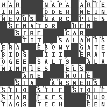 ACROSS 1. Armed conflict 4. California wine valley 8. Johnson of "Laugh-In" 12. Lyricist Gershwin 13. Baltic tributary 14. Chow _ 15. Mole, birthmark 18. Drug cop 19. Sliced desserts 20. Legislator 22. Layer 23. Beget 24. 4-wheeled motor vehicle 25. Teat (slang) 26. Deli grouping 30. Period 33. Black 36. Yard entry 37. Auction offers 39. One more than two 40. Part of Q.E.F. 41. Double curve, resembling the letter S 42. Table seasonings 44. Insect wing 45. Simpletons 47. Raised railways 50. A saturated hydrocarbon 51. Musical sound 53. R.R. building 54. Responses 57. Grain storage tower 59. Drop; flow; fall 61. Took without asking 63. Play the lead 64. Supplements with great effort 65. Superhero pair 66. Labels 67. Technology 68. Car or cant ending DOWN 1. Acquire through effort 2. Ancient Greek god of war 3. All-night dance parties 4. Words to Nanette 5. The sixth month of the Jewish calendar 6. For each 7. Curve 8. Electrical Measurement 9. It's straight from the horse's mouth 10. Neckwear 11. Followers of ems 16. A single undivided whole 17. Indian skirt 21. False hair 22. Actor Linden 24. Island 26. In a ____ (agitated or irritated) 27. Hindu Mythology: god of death 28. Slanted text style (abbr.) 29. Bristle 30. Inky black, to poets 31. Swiss mountan, "Queen of the Mountains" 32. An important port of Yemen 34. Prejudice 35. Lubricate 38. Legislators 42. Perceive with the eye 43. Elected reps. 46. _ tizzy (2 wds.) 48. Moos 49. Proofreading order 52. Eat (away) 53. Volcanic refuse 54. Actor Baldwin 55. Tender 56. Change direction abruptly 57. Fast jet (abbr.) 58. Call ___ day 59. Put into a specified state 60. Mamie's mate 62. A really long time