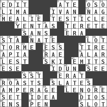 ACROSS 1. Prepare for publication 5. Had dinner 8. Bear (Spanish) 11. Pale green bean 12. _ the terrible 13. Tired old horse 14. Ear of corn 17. One of the two male reproductive glands 19. Gossips 21. Cylindrical with tapered ends 22. Without 23. Period 24. R.R. building 27. Nathan's nickname 29. Car dealer's back yard 32. Singer Mel 34. Curvy letter 36. Become fatigued 37. Capital of Western Samoa 38. Actress Charlotte 39. Having or resembling wings 40. For fear that 41. What Jean-Claude Killy likes to do 42. Gives off 43. Compass dir. 44. Goddess of spring and wife of Bragi 46. Observe 47. Fast jet (abbr.) 50. Part of Q.E.F. 52. Exposes to great heat 55. Chalkboards 57. Electrical Measurement 59. Poe poem 62. Put into a specified state 63. The content of cognition 64. "Vaya con ____" 65. Followers of ems 66. Animal enclosure 67. Position in a hierarchy or organization DOWN 1. Shade tree 2. Pass on 3. "If ____ say so..." 4. Falsehoods 5. "___ Maria" 6. Clothes sense 7. Keyboard key 8. At one time in the past 9. Table seasoning 10. Double curve, resembling the letter S 12. It is 15. Empty; void 16. Inactive volcano in Sicily 18. Retirement account (abbr.) 20. Michaelmas daisies 24. Lacking originality or spontaneity 25. Drinks excessively 26. Get up 28. 1973 Nobel Price Winner (Physics) Leo 29. Ms. Damita and namesakes 30. Declaim 31. Laconic 33. Floor protector 35. Beer mug 36. Scottish cap 42. Related on the mother's side 45. Mountain range 47. Compass dir. 48. Long narrow piece of something 49. Sadhe (variant) 51. Looks after 52. Raze (variant) 53. Sign of something about to happen 54. Tenement units (abbr.) 55. Ocean 56. Land 58. Commissioned military rank (abbr.) 60. Friend of Pooh 61. Eastern Standard Time (abbr.)