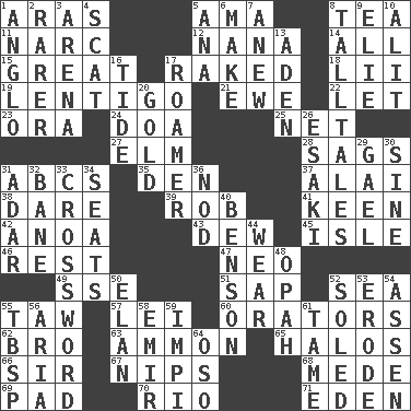 ACROSS 1. Ancient river in northeast Turkey 5. Housemaid (var.) 8. Beverage made from leaves 11. Drug cop 12. Grandmother 14. 100% 15. Relatively large 17. Moved through 18. Cards in a Roman deck? 19. Small, flat, pigmented spot on the skin 21. She-sheep 22. Allow 23. Mouth or opening 24. ___ good deed 25. Fish or hair follower 27. Shade tree 28. Sinks 31. Lettered men learn these first 35. Lair 37. Jai _ 38. Have the gumption 39. Director Reiner 41. Peachy ____! 42. Small Philippine buffalo 43. Morning condensation 45. Capri or Wight 46. Repose 47. Modern: prefix 49. Compass dir. 51. Plant excrement 52. Ocean 55. The 23rd letter of the Hebrew alphabet 57. Flowery wreath 60. Speakers 62. Sis' sibling 63. ID or VA city 65. Auras 66. Title for a knight 67. Pinches, bites 68. Ancient Persian 69. Groovy apt. 70. _ de Janeiro 71. Locale of original sin DOWN 1. White American of non-Hispanic descent 2. Less widely known 3. Sports stadium 4. Scram! 5. Santa ___, CA 6. Create 7. Afresh 8. Baron Munchausen's specialties 9. Writer Wiesel 10. Set down 13. An important port of Yemen 16. Periodic rise and fall of the sea level 17. Nomad 20. Gilded 26. 1973 Nobel Price Winner (Physics) Leo 29. Highlander 30. Trig term 31. The sixth month of the Jewish calendar 32. Object of repulsion 33. What you're doing now 34. Theater features 36. Dreamland 40. Gillaume's butler role 44. Erode 48. Brightly colored fish 50. Style 52. Having a sole or soles 53. Wear away 54. NE Netherlands city 55. Cook's measure (abbr.) 56. Operatic vocal solo 58. Arab leader 59. Body of Kaffir warriors 61. Not wild 64. Bear (Spanish)
