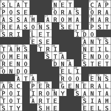 ACROSS 1. Narrow board 5. Fish or hair follower 8. Head covering 11. Introduce or present, as a question 12. Mouths or openings 14. Mouth or opening 15. Indian state 17. Odor 18. Impair 19. Thinks logically 21. Put into a specified state 22. Pacific Standard Time (abbr.) 23. Indian title of respect (Mr.) 24. Allow 25. Wedding promise 27. Compass dir. 28. Pismires 31. Scottish caps 35. Three (prefix) 37. Famous astronaut Armstrong 38. Presage 39. R.R. building 41. Inside; within (prefix) 42. Former U.S. Attorney General Janet 43. Heredity factor (abbr.) 45. Proofreading order 46. Southwest Nigerian state 47. Connecticut Ivy Leaguer 49. "One Day ___ Time" 51. Friend of Pooh 52. Followers of ems 55. Curve 57. For each 60. Commissioned military rank 62. Luau course 63. Literary sarcasm 65. Before Barbara or Clara 66. Small child 67. Johnson of "Laugh-In" 68. Thailand, formerly 69. Filthy place 70. A female animal or person 71. Snakelike fish DOWN 1. Practice fights 2. Failure 3. Slender Brazilian palm 4. Afternoon social gatherings 5. Not either 6. Greek god of love 7. Not wild 8. Part 9. Caspian sea tributary 10. Piece 13. Suttee (variant) 16. Undercover agent 17. Michaelmas daisies 20. Egg locale 26. Natives or inhabitants of Denmark 29. Event that recurs at intervals 30. Groove 31. "Corrida" creature 32. So be it 33. Ananias' fault 34. Snout, nose 36. It would 40. Disorder of the immune system 44. _ vera 48. Charged particles 50. Capital of Western Samoa 52. Bert's buddy 53. Brizilian seaport 54. Hits or strikes with great force 55. Tenement units (abbr.) 56. Carrot, for example 58. Blunders 59. Writer of Portnoy's Complaint (1969) 61. Relaxation 64. Born