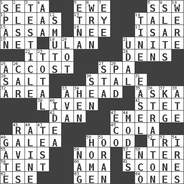 ACROSS 1. Stalk of a moss capsule 5. She-sheep 8. Compass dir. 11. Entreaties 13. Attempt to accomplish something 14. Lie 15. Indian state 16. Born 17. Austrian river, tributary to the Danube 18. Fish or hair follower 19. ____ Bator, Mongolia 21. Join together 22. "Tell ____ the Marines!" 24. Cub Scout units 25. Buttonhole 27. Health resort 29. Table seasoning 30. Showing deterioration from age 32. Length times width 33. At or in the front 35. "____ silly question..." 39. Make or become more lively 41. Proofreading order 42. One of the 12 tribes of Israel 43. Develop 45. Pace 48. Root beer relative 49. An organ shaped like a helmet 50. Parka part 52. Three (prefix) 55. Opinion 56. And not 57. Keyboard key 59. Portable shelter 60. Wet nurse (var.) 61. Biscuitlike quick bread 62. Compass dir. 63. Commissioned mil. rank 64. Singles DOWN 1. Connect, as a bridge 2. Otherwise 3. One of the two male reproductive glands 4. American Automobile Association (abbr.) 5. Inactive volcano in Sicily 6. Songbird 7. Sight organ 8. Indian antelope 9. Narrow boards 10. We are 12. Obscenities 14. Prong on a fork 20. Car dealer's back yard 21. Hereditary estate 23. Add up to 25. White ___ sheet 26. Automobile 27. R.R. building 28. Writing tablet 30. Elected rep. 31. Artist's stand 33. Actress Gardner 34. Layer 36. Ski resort town in Vermont 37. Cask 38. Had dinner 40. It may be bright or harebrained 43. Environmental prefix 44. Methods 45. All-night dance parties 46. Place in a line 47. Trial 49. Yard entry 50. Residence 51. Northwest Algerian city 53. French philosopher Descartes 54. Angers 56. Tired old horse 58. Non-commissioned officer (abbr.)