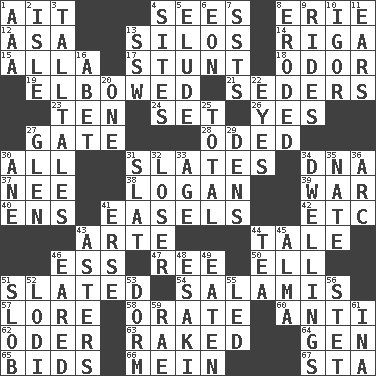ACROSS 1. Small island 4. Observes 8. One of the Great Lakes 12. White ___ sheet 13. Grain storage towers 14. Port city in Latvia 15. Silent film actress Nazimova 17. Difficult or unusual or dangerous feat 18. Aroma 19. Turned at an angle; bent 21. Spring feasts 23. "___ Little Indians" 24. Put into a specified state 26. Affirmative reply 27. Yard entry 28. Wrote a lyric poem 30. 100% 31. Chalkboards 34. Heredity factor (abbr.) 37. Born 38. Utah city north of Ogden 39. Armed conflict 40. Followers of ems 41. Artist's stands 42. And so on (abbr.) 43. Johnson of "Laugh-In" 44. Falsehood 46. Curvy letter 47. To separate or throw off 50. Pipe bend 51. Scheduled 54. Deli grouping 57. Old wives' tales, e.g. 58. Speak pompously 60. Opposed to 62. Baltic tributary 63. Moved through 64. Commissioned mil. rank 65. Auction offers 66. Count _ (2 wds.) 67. R.R. building DOWN 1. Auto club (abbr.) 2. Small island 3. Baron Munchausen's specialties 4. Settings 5. Dodge 6. Period of immesurable duration 7. Fast planes 8. Eaten away 9. Amusement-park features 10. Composer Stravinsky 11. Hearing organs 13. Compass dir. 16. Collude with 20. Single 22. Snake ____ (dice throw) 25. Add up to 27. Small, secluded valley 29. Hiding places for outlaws 30. A saturated hydrocarbon 31. Narrow board 32. Failure 33. Ripen 34. Homes 35. Nathan's nickname 36. Curve 41. Celtic language 43. Michaelmas daisies 44. Beverage made from leaves 45. _ mater 46. Having ears or earlike features 48. 1973 Nobel Price Winner (Physics) Leo 49. Consumed 51. Oscar Madison type 52. Farming town in central California 53. Dormintory (informal) 55. Directed 56. Proofreading order 59. Actress Charlotte 61. _ tizzy (2 wds.)