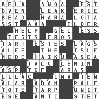 ACROSS 1. Actor Lugosi 5. Small Philippine buffalo 9. Eastern Standard Time (abbr.) 12. Baking chamber 13. Path through which fluid escapes 14. 4th largest of the Great Lakes 15. Necklace unit 16. Hindu Mythology: god of death 17. Globular water bottle used in Asia 18. Fast jet (abbr.) 19. Auto club (abbr.) 21. A person who is older than you are 22. Aid 24. Set 26. Curvy letter 27. Trials 28. Greek god of love 29. Small pie 30. _____ Park, CO 32. Straggles 36. Toward shelter 37. Definite Article 38. Small island 39. Ancient Persian 40. Japanese poetic form 42. At sea 43. Baby powder 44. Soviet premier 1918-24 46. Cleo's killer 49. Binary compound 50. Ancient river in northeast Turkey 51. Pale purple color 53. _ tizzy (2 wds.) 54. Nine, plus one 57. Having or resembling wings 58. First man 61. Diluted with white 62. Carryall 63. Canvas cover 64. A single undivided whole 65. Compass dir. 66. Against 67. Proofreading order DOWN 1. Moves up and down 2. Nights before holidays 3. Tough but pliablecoriaceous 4. Plus 5. _ mater 6. Teachers' org. 7. Rowing implement 8. Alias (abbr.) 9. Eat (away) 10. Settings 11. Lacerates 14. Pipe bend 19. Keyboard modifier key 20. Domed church section 21. Raised railways 23. First name in cosmetics 24. Hellenic 25. Greek goddess of the dawn 27. Story 28. Moral principle 29. Scottish cap 31. Showing deterioration from age 32. Woody, climbing, usually tropical plant 33. Aide 34. Small, secluded valley 35. Ocean 40. Possessed 41. ____ Bator, Mongolia 43. Nervous spasm 45. Period 46. Having winglike extensions 47. Grain storage towers 48. Food holder 52. "We ___ not amused" (Victoria) 53. Body of Kaffir warriors 55. Writer Wiesel 56. Remaining after all deductions 58. _ moment's notice (2 wds.) 59. Daniel's nick name 60. Tate display 61. Ichor