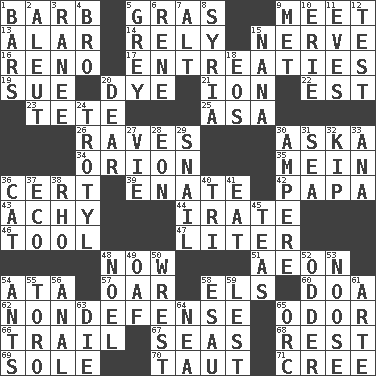 ACROSS 1. Sharp remark 5. Pate de foie ____ 9. Rendezvous 13. Having or resembling wings 14. Trust 15. Effrontery 16. Western Nevada city 17. Pleas 19. Institute legal proceedings 20. Color 21. Electrically charged atom 22. Eastern Standard Time (abbr.) 23. False hair 25. White ___ sheet 26. All-night dance parties 30. "____ silly question..." 34. Constellation of myth 35. Count _ (2 wds.) 36. An absolute certainty 39. Related on the mother's side 42. Dad 43. Painful 44. Feeling or showing extreme anger 46. Utensil 47. 61 cubic inches 48. Immediately 51. Period of immesurable duration 54. "One Day ___ Time" 57. Boat paddle 58. Raised railways 60. ___ good deed 62. Unrelated to defense, as in spending 65. Scent 66. Lag or linger behind 67. Oceans 68. Relief 69. Flatfish 70. Pulled tight 71. Algonquian DOWN 1. Oblong pieces of solid material 2. Native American of Southwest Alaska 3. The wife of a rajah (variant) 4. Sis' sibling 5. Jennifer or Joel 6. French philosopher Descartes 7. The first octave above the treble staff 8. Damascus' land 9. Was introduced to 10. One of the Great Lakes 11. Nights before holidays 12. Trial 15. Nanny 18. Greek goddess of the dawn 20. Letter starter 24. TNT 27. Compete 28. A really long time 29. Slow-paced one 30. Electrical Unit 31. Ocean 32. Sleep 33. Santa ___, CA 36. Domesticated feline 37. Environmental prefix 38. 17th letter of the Greek alphabet 40. Three (prefix) 41. Erode 45. Beverages made from leaves 48. Christmas carol 49. Clumsy lout 50. Take or capture by force 52. More peculiar 53. Trap for birds or small mammals 54. Pismires 55. "Corrida" creature 56. Of or related to the anus 58. He sold his birthright 59. For fear that 61. Johnson of "Laugh-In" 63. Expire 64. Teachers' org. 65. The grampus (Milton)