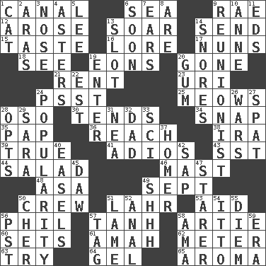 ACROSS 1. Lessep's creation 6. Ocean 9. Actress Charlotte 12. Came up 13. Fly high 14. Transmit 15. Clothes sense 16. Old wives' tales, e.g. 17. Religious women 18. Observe 19. Immeasurably long periods of time 20. Went 21. Monthly bill 23. RI univ. 24. Inconspicuous attention getter 25. Catcalls? 28. Bear (Spanish) 30. Watches over 34. Fastener 35. Infant food 36. Arrive at 38. Lyricist Gershwin 39. Loyal 41. Goodbye (Sp.) 43. Fast jet (abbr.) 44. First course 46. Vertical spar for supporting sails 48. White ___ sheet 49. Back-to-school mo. 50. Group working together 51. Cowardly lion portrayer 53. Help 56. Silvers or Donahue 57. Hyperbolic tangent 58. Nick name for Arthur 60. Puts into a specified state 61. Wet nurse 62. Distance measurement 63. Attempt to accomplish something 64. Set 65. Odor DOWN 1. Domesticated feline 2. Caspian sea tributary 3. Sense of smell 4. Michaelmas daisies 5. Area sheltered from the wind 6. Within a short period 7. Hearing organs 8. "We ___ not amused" (Victoria) 9. One who advocates reunion 10. Queen of England 1702-14 11. Begley and Asner 13. Groove 14. Sounds asleep 19. Keyboard key 20. Chewing product 22. Eastern Standard Time (abbr.) 24. Teen's desire 26. Armed conflicts 27. Petty quarrel 28. Elects 29. "Two Mules for Sister ____" 31. Teachers' org. 32. Male parent 33. _-fi 37. Baseball hit which scores a run 40. Artist's stands 42. Plant excrement 45. Simpleton 47. A viewer who gazes fixedly 49. Quiet! 50. "Mermaids" star 51. Unable to walk 52. Of or related to the anus 54. "Tell ____ the Marines!" 55. South Vietnam president (1954) 56. Pacific Standard Time (abbr.) 57. Label 58. Nanny (var.) 59. Epoch