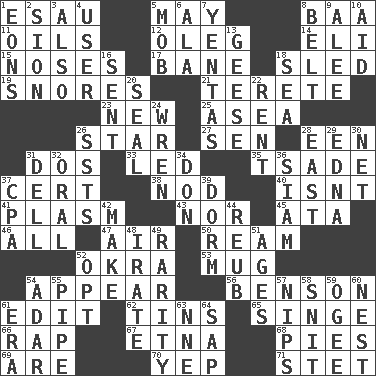ACROSS 1. Son of Isaac 5. Fifth month 8. Sound made by sheep 11. Petroleums 12. Cassini of fashion 14. Connecticut Ivy Leaguer 15. Olfactory organs 17. Object of repulsion 18. Downhill vehicle 19. Sounds asleep 21. Cigar-shaped 23. ___ Haven, CT 25. At sea 26. Play the lead 27. Elected rep. 28. Car or cant ending 31. Two (Sp.) 33. Directed 35. Sadhe (variant) 37. Foregone conclusion 38. Lower and raise head in agreement 40. Is not 41. Suffix with ecto or cyto 43. And not 45. "One Day ___ Time" 46. Everything 47. Atmosphere 50. 480, 500 or 516 sheets of paper 52. Gumbo ingredient 53. Large cup 54. Become visible 56. Gillaume's butler role 61. Prepare for publication 62. Airtight sealed metal containers 65. Scorch 66. Hit sharply and swiftly 67. Inactive volcano in Sicily 68. Sliced desserts 69. "We ___ not amused" (Victoria) 70. Slangy assent 71. Proofreading order DOWN 1. Immeasurably long periods of time 2. The Jewish people; Israel 3. In addition 4. One who uses or employs something 5. Crowd into 6. Insect wing 7. Gossips 8. Waist strap 9. Toward shelter 10. Assist 13. Honkers 16. Emitted 18. Ocean 20. Lick closed 22. Monthly bill 24. Songbird 26. Fast planes 28. 90 degrees 29. Pulitzer Prize-winning author Ferber 30. Fish or hair follower 31. Small valley 32. Of the mouth 34. Spanish title 36. Thailand, formerly 37. Numbers guy (abbr.) 39. Dormintory (informal) 42. Create 44. Reuben's nickname 48. Feeling or showing extreme anger 49. Noteworthy scarcity 51. Grows older 52. Elect 54. The sixth month of the Jewish calendar 55. Corncob 57. Pinches, bites 58. In a ____ (agitated or irritated) 59. Double curve, resembling the letter S 60. Egg locale 61. Epoch 63. Compass dir. 64. Plant excrement