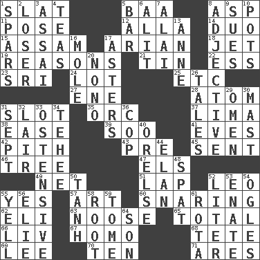 ACROSS 1. Narrow board 5. Sound made by sheep 8. Viper 11. Airs 12. Silent film actress Nazimova 14. Superhero pair 15. Indian state 17. Believer in; advocate of (suffix) 18. Passenger plane 19. Thinks logically 21. Metal container 22. Curvy letter 23. Indian title of respect (Mr.) 24. Car dealer's back yard 25. And so on (abbr.) 27. Compass dir. 28. Tiny particle 31. Slit 35. The grampus (Milton) 37. Pale green bean 38. Comfort 39. "Barney Miller" actor Jack 41. Nights before holidays 42. Heart or essence 43. Before (prefix) 45. Transmitted 46. Family _ (genealogy) 47. Raised railways 49. Fish or hair follower 51. Pet locale 52. Lion 55. Affirmative reply 57. Tate display 60. Catching in a trap 62. Connecticut Ivy Leaguer 63. Trap for birds or small mammals 65. "_____ Recall" 66. 54 in ancient Rome 67. Same (prefix) 68. False hair 69. Area sheltered from the wind 70. Nine, plus one 71. Ancient Greek god of war DOWN 1. Practice fights 2. Failure 3. Slender Brazilian palm 4. Beverages made from leaves 5. Oblong piece of solid material 6. Came down and settled, as after flight 7. Jai ____ 8. Descriptive word 9. Takes to court 10. Cooking vessels 13. Singer Murray 16. Undercover agent 17. Michaelmas daisies 20. Words to Nanette 26. Falsehoods 29. Sign of something about to happen 30. Vertical spar for supporting sails 31. Back-to-school mo. 32. Den 33. Clearly or manifestly demonstrative 34. Giggle 36. Police officer (slang) 40. Threatening words 44. Liveliness 48. Petty quarrel 50. Hyperbolic tangent 52. 61 cubic inches 53. Related on the mother's side 54. Stares 55. Shout 56. Writer Wiesel 58. Carrot, for example 59. Heavy book 61. Round or rotation of duties 64. Male offspring
