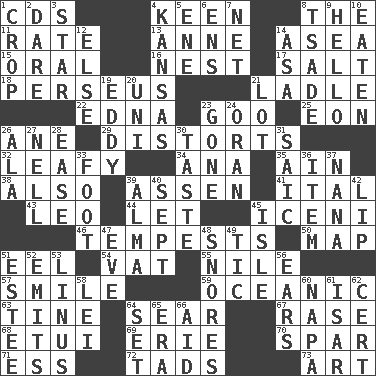 ACROSS 1. Music discs 4. Peachy ____! 8. Definite Article 11. Assign a rank or rating to 13. Singer Murray 14. Toward the sea 15. Taken by mouth 16. Egg locale 17. Table seasoning 18. Son of Zeus who helped slay Medusa 21. Dipping utensil 22. Pulitzer Prize-winning author Ferber 23. Thick or sticky substance 25. Age 26. A saturated hydrocarbon 29. What propaganda does 32. Like summer trees 34. Santa ___, CA 35. The 18th letter of the Arabic alphabet 38. In addition 39. NE Netherlands city 41. Slanted text style (abbr.) 43. Lion 44. Allow 45. Ancient Celtic tribe of eastern Britain 46. Storms 50. Atlas unit 51. Snakelike fish 54. Large container 55. "Death on the ____" 57. Grin 59. Pertaining to the sea 63. Prong on a fork 64. Shrivel 67. Raze (variant) 68. Needle case 69. One of the Great Lakes 70. Practice fight 71. Double-curved letter 72. Bits 73. Tate display DOWN 1. Riding implement 2. Have the gumption 3. Play the lead 4. Sunflower state 5. Compass dir. 6. Followers of ems 7. Fish or hair follower 8. Sadhe (variant) 9. Phone greeting 10. Eroded 12. Otherwise 14. White ___ sheet 19. Whirlpool 20. University (slang) 21. Car dealer's back yard 23. Went 24. NW Algerian seaport 26. Chicken ___ king 27. 1994 drama film starring Jodie Foster 28. Relaxation 30. Clothes sense 31. Ketch in the Levant 33. Pick up the tab 36. A distinct part 37. Grandmother 39. _ mater 40. Back-to-school mo. 42. Mouth edge 45. Capri or Wight 47. Night before a holiday 48. Sounds asleep 49. Nervous spasm 51. First name in cosmetics 52. Sends forth 53. "_ and Lucy" (Charlie Brown theme song) 56. Hearing organs 58. Flowery wreath 60. California wine valley 61. Austrian river, tributary to the Danube 62. Foregone conclusion 64. Arrange properly for use 65. Period 66. Help