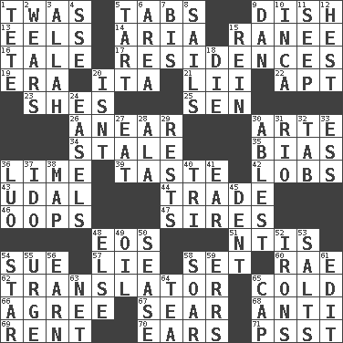 ACROSS 1. It was, poetically 5. Bar bills 9. Food container 13. Snakelike fish 14. Operatic vocal solo 15. Indian princess (variant) 16. Lie 17. Homes 19. Period 20. Call ___ day 21. Cards in a Roman deck? 22. Fitting 23. "______ My Girl" (Turtles hit) 25. Elected rep. 26. Approach 30. Johnson of "Laugh-In" 34. Showing deterioration from age 35. Prejudice 36. Welles in "The Third Man" 39. Clothes sense 42. Tennis shots 43. Hereditary estate 44. Barter 46. I made a mistake 47. Fathers 48. Greek goddess of the dawn 51. Nuclear Threat Initiatives 54. Take to court 57. Untruth 58. Arrange properly for use 60. Actress Charlotte 62. Interpreter 65. Chilled 66. Match 67. Scorch 68. Against 69. Monthly bill 70. Hearing organs 71. Inconspicuous attention getter DOWN 1. Wig 2. Erodes 3. Assad's deity 4. Compass dir. 5. Small pie 6. Type of rug 7. Again 8. Moves on water 9. One of the 12 tribes of Israel 10. South American Indian 11. Ooze 12. Command 15. It's straight from the horse's mouth 18. Pass on 20. Is not 24. Artist's stands 27. Consume 28. Wing 29. Musical pauses 30. Most capable 31. River (Sp.) 32. Bar bill 33. Curvy letter 36. Nilotic language 37. Wedding promise 38. Atlas unit 40. Three (prefix) 41. Ewer handle 45. Scratch 48. Otherwise 49. Lubricate 50. Gospel singer Marvin 52. Removes the wrinkles 53. Table seasonings 54. Play the lead 55. Goad 56. Merit 58. Fly high 59. Blunders 61. Prepare for publication 63. Fish or hair follower 64. Afternoon social gathering 65. Head covering