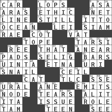 ACROSS 1. 4-wheeled motor vehicle 4. Chops off 8. White ___ sheet 11. Ancient river in northeast Turkey 13. Value system 15. Fish or hair follower 16. Actor's bit 17. Not moving 18. "Tell ____ the Marines!" 19. Sea 21. Flowery wreath 22. Thailand, formerly 23. Actress Charlotte 24. Small bed 27. Large container 29. Drink excessively 30. Tarsus (plural) 34. Portuguese money of account (variant) 36. Not this but _ 39. Approach 40. Groovy apts. 41. Former Milwaukee Brewers owner Bud 43. Oblong pieces of solid material 44. National forest in Provo, Utah 46. Inactive volcano in Sicily 47. RI univ. 48. Slow-paced one 49. To provide with a ceiling 51. Feline 53. Affectionate concern, for short 54. Compass dir. 57. Mountain range 60. One (Scot) 63. Sends forth 65. Thickened enlargement 66. Lacerates 69. Set down 70. Call ___ day 71. Come out of 72. Hero or heavy, e.g. 73. Scottish cap 74. Adolescent 75. Observe DOWN 1. Bodily heat indicating an inflammation 2. N. Chile seaport 3. Indian princess (variant) 4. French article 5. Baseball player Mel 6. Silvers or Donahue 7. Filth; sediment 8. Opposed to 9. Stalk of a moss capsule 10. Smallest unit of an element 12. Ocean 14. 154 in Roman numerals 18. Byzantium, centuries later 20. Non-commissioned officer (abbr.) 25. Chooses 26. Giggle 28. "One Day ___ Time" 29. A testis 31. Buttocks 32. Indian skirt 33. Big collection agency 34. Water falling in drops from the sky 35. Pulitzer Prize-winning author Ferber 37. Keyboard modifier key 38. Colored lightly or faintly 40. Fluid product of inflammation 42. Highlander 45. Chicken ___ king 50. Frozen water 52. Jacques of French films 54. Grain storage towers 55. Vertical member of a panel or frame 56. First name in cosmetics 57. A single undivided whole 58. Round or rotation of duties 59. First man 61. A home for chicks 62. Comfort 64. Third mo. 67. Sorrow 68. Elected rep.