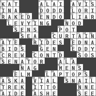 ACROSS 1. Krazy ___ of comics 4. Mountain range southwest of Kyrgyzstan 8. Deliberation 12. _ tizzy (2 wds.) 13. Texas town _ City 14. Australian parrot (variant) 15. Swept the length of 18. Inside; within (prefix) 19. One who doesn't tell the truth 20. Imposing or collecting, as a tax 22. Lower and raise head in agreement 23. Elected reps. 24. Cooking vessel 25. Ocean 26. Window treatment 30. Had dinner 33. Amusement-park features 36. Pulitzer Prize-winning author Ferber 37. Auction offers 39. Commissioned mil. rank 40. Whirlpool 41. Group working together 42. Continued (abbr.) 44. Mayday 45. Legislator 47. Wing 50. Tired old horse 51. Not women's 53. Shade tree 54. Portable computers 57. "____ silly question..." 59. Small bottle 61. Slow-paced one 63. Long journey 64. "Tell ____ the Marines!" 65. Compass dir. 66. Assistant 67. American tennis player Robert 68. Perceive with the eye DOWN 1. Apertif with cassis 2. Of or related to the anus 3. Receives possession of 4. An important port of Yemen 5. Yearn 6. Find the sum of 7. Wedding promise 8. One to whom something is allotted 9. Empty area or space 10. Retirement account (abbr.) 11. Title for a knight 16. Nights before holidays 17. Centimeter-gram-second unit of force 21. Austrian river, tributary to the Danube 22. Or not 24. Suppuration 26. Penny 27. Sums up 28. Southeast Asian peninsula 29. Negative votes 30. Lettered men learn these first 31. Hoop that covers a wheel 32. Locale of original sin 34. Composer Stravinsky 35. Lair 38. Tchaikovsky ballet 42. Gear tooth 43. Moist 46. Scottish cap 48. Allows 49. Soon (poet.) 52. Connects, as a bridge 53. Made supply last 54. Thin strip of wood or metal 55. _ vera 56. Trig term 57. _ moment's notice (2 wds.) 58. _ Lanka 59. By way of 60. ___ a Wonderful Life 62. Area sheltered from the wind