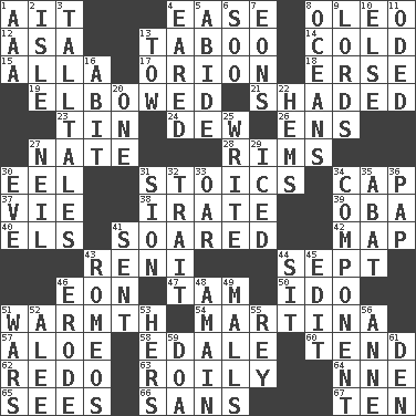 ACROSS 1. Small island 4. Relaxation 8. Margarine 12. White ___ sheet 13. Off limits 14. Having a low temperature 15. Silent film actress Nazimova 17. Greek mythologigal hunter 18. Celtic language 19. Turned at an angle; bent 21. Cast a shadow over 23. Shallow baking pan 24. Morning condensation 26. Followers of ems 27. Nathan's nickname 28. Basketball hoops 30. Snakelike fish 31. Unemotional ones 34. Head covering 37. Compete 38. Feeling or showing extreme anger 39. Chief or king in Benin or Nigeria 40. Raised railways 41. Flew 42. Atlas unit 43. Painter Guido (1575-1642) 44. Back-to-school mo. 46. Period of immesurable duration 47. Scottish cap 50. Wedding promise 51. Heat 54. Chrissie's court nemesis 57. Medicinal plant 58. Peak District village in England 60. Watch over 62. Do over again 63. Turbulent 64. Compass dir. 65. Perceives with the eye 66. Without 67. Nine, plus one DOWN 1. American Automobile Association (abbr.) 2. Small island 3. Baron Munchausen's specialties 4. Having ears or earlike features 5. Tolerate 6. "Barney Miller" actor Jack 7. Immeasurably long periods of time 8. Seas 9. Domineers 10. Otherwise 11. Wrote a lyric poem 13. Pull behind 16. "This won't hurt ____!" 20. Single 22. Folds over and sews together 25. Compose 27. Famous astronaut Armstrong 29. On the rocks 30. First lady 31. The Jewish people; Israel 32. Distinguishing feature 33. Boat paddle 34. Part 35. Blind as ____ 36. Infant food 41. Transmitted 43. Lover boys 44. Be seated 45. Prepare for publication 46. Wear away 48. With great haste 49. Shopping centers 51. Armed conflicts 52. Toward shelter 53. Possessive pronoun 55. Marina Del _, California 56. Singer Murray 59. ___ good deed 61. Lair