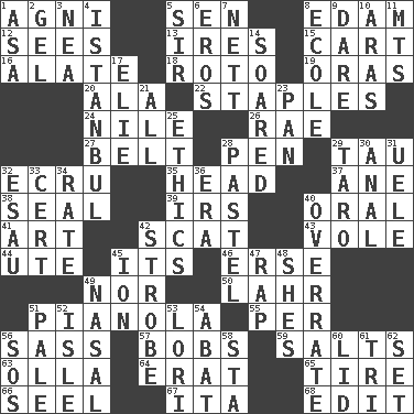ACROSS 1. Hindu god of fire 5. Elected rep. 8. Dutch treat 12. Observes 13. Angers 15. Draw slowly or heavily 16. Having winglike extensions 18. Printing process, for short 19. Mouths or openings 20. Chicken ___ king 22. Paper fasteners 24. Mediterranean tributary 26. Actress Charlotte 27. Waist strap 28. Animal enclosure 29. The 19th letter of the Greek alphabet 32. Shade of tan 35. Froth on beer 37. A saturated hydrocarbon 38. Lick closed 39. Big collection agency 40. Taken by mouth 41. Tate display 42. Get outta here! 43. Short-tailed, large-bodied rat 44. Shoshoni 45. It is 46. Celtic language 49. Or not 50. Cowardly lion portrayer 51. Player piano 55. For each 56. Backtalk 57. Moves up and down 59. Table seasonings 63. Rounded earthenware pot or jar 64. Part of Q.E.F. 65. Become fatigued 66. Sew up the eyelids of hawks and falcons 67. Call ___ day 68. Prepare for publication DOWN 1. White ___ sheet 2. Set 3. Teachers' org. 4. Byzantium, centuries later 5. Title for a knight 6. Greek god of love 7. Remaining after all deductions 8. Learning spot: Fr. 9. Have the gumption 10. Caspian sea tributary 11. Mountains (abbr.) 14. Flew 17. Writer Wiesel 21. Everything 23. Baking dish 25. Principles of right and wrong 28. Soft color 29. Pacific island yam 30. Of or related to the anus 31. Ubangi River tributary 32. He sold his birthright 33. An absolute certainty 34. Assign a rank or rating to 36. Period 40. Make much ado about nothing 42. Disco prop 45. Electrically charged atom 47. Strike 48. "______ My Girl" (Turtles hit) 49. Relating to the nose 51. Light colored 52. Small island 53. Australian parrot (variant) 54. Blind as ____ 56. Distress signal 58. R.R. building 60. Flaplike covering 61. Three (prefix) 62. Put into a specified state