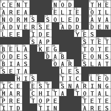 ACROSS 1. Penny 5. Allow head to fall sleepily 8. Definite Article 11. Length times width 12. Writer Wiesel 14. Lubricate 15. Typical standards 17. Having a sole or soles 18. Actress Gardner 19. Contrary to your interests or welfare 21. Say or write further 22. Lair 23. Area sheltered from the wind 24. Binary compound 25. Affirmative reply 27. Plant excrement 28. Proofreading order 31. Actor Lugosi 35. Cask 37. Lug 38. Lyric poems 39. Pat or tap gently 41. Immeasurably long periods of time 42. Prejudice 43. Boat paddle 45. Narrow board 46. Bristle 47. French article 49. Part of HMS, perhaps 51. Nervous spasm 52. Lion 55. Frozen water 57. Eastern Standard Time (abbr.) 60. Catching in a trap 62. Impair 63. Riviera of "Kiss of the Spider Woman" 65. Add up to 66. Before (prefix) 67. Drink excessively 68. Wig 69. It would 70. Shallow baking pan 71. Ancient Greek god of war DOWN 1. Lessep's creation 2. Wear away 3. Boldness 4. Docile 5. Modern: prefix 6. Water jar 7. Passed on 8. Inedible or poisonous agaric 9. Hub of activity 10. Style 13. Whirlpool 16. Indian titles of respect 17. Oozed 20. Neighbor of Neb. 26. _____ Park, CO 29. Inactive volcano in Sicily 30. Trial 31. Moves up and down 32. Singer Brickell 33. Resembling or made to resemble leather 34. Slender Brazilian palm 36. E Mali city 40. Greek mezzo-soprano Agnes 44. It's straight from the horse's mouth 48. Scram! 50. Religious group 52. 61 cubic inches 53. Related on the mother's side 54. Stares 55. Body of Kaffir warriors 56. Haul 58. Opportunity 59. Native american tent (variation) 61. Roll call or roster of names 64. "___ Little Indians"