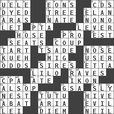 ACROSS 1. Ubangi River tributary 5. Immeasurably long periods of time 9. Music discs 12. Colored 13. Family _ (genealogy) 14. Liveliness 15. Caspian sea tributary 16. Nathan's nickname 17. Words to Nanette 18. Allow 19. Parent Teacher Association (abbr.) 21. Crowbar 22. Stockings 24. Adept person 26. Eastern Standard Time (abbr.) 27. Theater features 28. Overturn; upset 29. Small pie 30. Sadhe (variant) 32. Characteristic smell of wine 36. Malaysian steamed pastry 37. Russian fighter aircraft 38. One who uses or employs something 39. Likelihood 40. Fathers 42. Singer James 43. _ and Stitch 44. All-night dance parties 46. Numbers guy (abbr.) 49. Had dinner 50. Picture 51. Columnist Joseph or Stewart 53. Girls' org. (abbr.) 54. Insidious 57. A home for chicks 58. Ballerina skirt 61. Hub of activity 62. Blind as ____ 63. Operatic vocal solo 64. Morally bad or wrong 65. Flowery wreath 66. South Vietnam president (1954) 67. Famous astronaut Armstrong DOWN 1. Allodial 2. Jane of fiction 3. Tough but pliablecoriaceous 4. Begley and Asner 5. Inactive volcano in Sicily 6. Mouth or opening 7. Fish or hair follower 8. Perceive with the eye 9. Garlic unit 10. Natives or inhabitants of Denmark 11. Derisive sound 14. Compass dir. 19. Pacific Standard Time (abbr.) 20. Trial 21. Chop off 23. Profane or obscene expressions 24. Puddle 25. Sorrow 27. Saudi Arabian king (1953-1964) 28. Capital of Egypt 29. Ring climax 31. Grin 32. New (sp.) 33. Clearly or manifestly demonstrative 34. Puts into a specified state 35. Period 40. Be seated 41. Indian titles of respect 43. Pet locale 45. Alias (abbr.) 46. Lessep's creation 47. Cadet 48. Slender Brazilian palm 52. Baseball player Mel 53. Island territory of the United States 55. 57 in ancient Rome 56. Shout 58. Bit 59. RI univ. 60. Neckwear 61. Layer