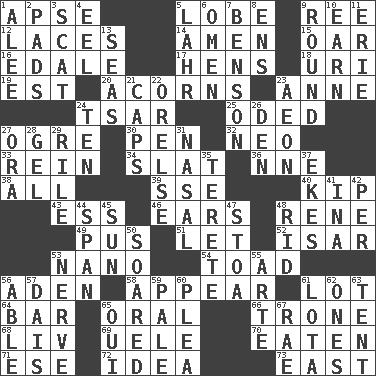 ACROSS 1. Domed church section 5. Ear part 9. Portuguese money of account (variant) 12. Shoestrings 14. So be it 15. Rowing implement 16. Peak District village in England 17. Coop moms 18. RI univ. 19. Eastern Standard Time (abbr.) 20. Oak nuts 23. Singer Murray 24. Russian ruler of old 25. Wrote a lyric poem 27. Legendary monster 30. Animal enclosure 32. Modern: prefix 33. It's straight from the horse's mouth 34. Narrow board 36. Compass dir. 38. Everything 39. Compass dir. 40. Monetary unit of Laos 43. Double-curved letter 46. Hearing organs 48. French philosopher Descartes 49. Fluid product of inflammation 51. Allow 52. Austrian river, tributary to the Danube 53. Billionth: prefix 54. Frog relative 56. An important port of Yemen 58. Seem 61. Car dealer's back yard 64. Oblong piece of solid material 65. Of the mouth 66. Heavy duty weighing machine 68. 54 in ancient Rome 69. Ubangi River tributary 70. Consumed 71. Compass dir. 72. It may be bright or harebrained 73. 90 degrees DOWN 1. Toward shelter 2. Groovy apts. 3. Leave at once 4. Snakelike fish 5. Cowardly lion portrayer 6. Sign of something about to happen 7. Gillaume's butler role 8. Followers of ems 9. Single shot of ammunition 10. Merit 11. 4th largest of the Great Lakes 13. Oceans 21. Balmoral and tarboosh 22. Threatening words 23. A really long time 24. "___ Little Indians" 26. Lair 27. Mouth or opening 28. Set 29. Cause heat under the collar 31. Relating to the nose 35. Cylindrical with tapered ends 37. Supplements with great effort 41. _ tizzy (2 wds.) 42. For each 44. Connect, as a bridge 45. Player for Phoenix 47. Portico 48. To free from 50. Flew 53. Effrontery 55. Johnson of "Laugh-In" 56. Competent 57. Raised platform 59. Diluted with white 60. Entreaty 61. Globular water bottle used in Asia 62. Washington bills 63. Portable shelter 65. Fr. "Yes" 67. Actress Charlotte