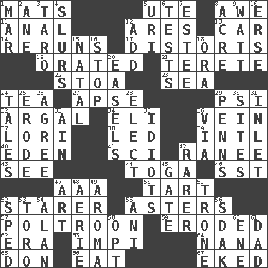 ACROSS 1. Floor protectors 5. Shoshoni 8. Deep reverence 11. Of or related to the anus 12. Ancient Greek god of war 13. Automobile 14. Summer TV shows 17. What propaganda does 19. Spoke pompously 21. Cylindrical with tapered ends 22. Portico 23. Ocean 24. Afternoon social gathering 27. Domed church section 29. Air pressure measure (abbr.) 32. Therefore, facetiously 34. Connecticut Ivy Leaguer 36. Distinctive style or manner 37. Australian parrot (variant) 38. Directed 39. International (abbr.) 40. Genesis locale 41. _-fi 42. The wife of a rajah (variant) 43. Observe 44. Ancient Roman robe 46. Fast jet (abbr.) 47. American Automobile Association (abbr.) 50. Small pie 52. A viewer who gazes fixedly 55. Michaelmas daisies 57. Coward 59. Eaten away 62. Epoch 63. Body of Kaffir warriors 64. Grandmother 65. Spanish title 66. Consume 67. Supplemented with great effort DOWN 1. Impair 2. A saturated hydrocarbon 3. Edible starchy tuberous root 4. Disparaging remarks 5. RI univ. 6. Trials 7. First name in cosmetics 8. Land measure 9. Electrical Unit 10. Celtic language 12. Find the sum of 15. Relating to or accompanying birth 16. Constrict 18. Mouth or opening 20. Artist's stands 24. Stories 25. Eat (away) 26. Match 28. Voters do this 29. Actor Sean's family 30. Settings 31. An arm off of a larger body of water 33. The 18th letter of the Arabic alphabet 35. Foolish or stupid persons 36. By way of 42. More uncommon 45. Yard entry 47. Nonscientific branch of learning 48. Nest on high 49. Odor 51. Heavy duty weighing machine 52. Drove too fast 53. "Corrida" creature 54. Actor Alda or Thicke 55. Black tropical American cuckoo 56. Neighbor of Neb. 58. Elect 60. Compass dir. 61. Male parent