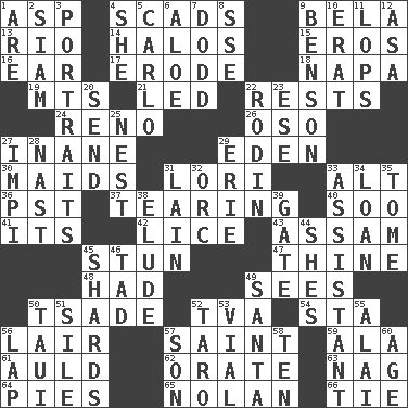 ACROSS 1. Viper 4. Large numbers or amounts 9. Actor Lugosi 13. _ de Janeiro 14. Radiant circles of light 15. Greek god of love 16. Ewer handle 17. Wear away 18. California wine valley 19. Mountains (abbr.) 21. Directed 22. Musical pauses 24. Former U.S. Attorney General Janet 26. Bear (Spanish) 27. Silly 29. Locale of original sin 30. Women servants 31. Australian parrot (variant) 33. The first octave above the treble staff 36. Pacific Standard Time (abbr.) 37. Rending 40. "Barney Miller" actor Jack 41. ___ a Wonderful Life 42. Louse (plural) 43. Indian state 45. Astound 47. One or ones belonging to thee 48. Possessed 49. Perceives with the eye 50. Sadhe (variant) 52. Federal power corp. 54. R.R. building 56. Den 57. Inhabitant of Heaven 59. Chicken ___ king 61. Old (Scot.) 62. Speak pompously 63. Tired old horse 64. Sliced desserts 65. Pitcher Ryan 66. Standoff DOWN 1. "We ___ not amused" (Victoria) 2. Thailand, formerly 3. Likenesses of persons 4. A female animal or person 5. Monte _, Las Vegas Hotel/Casino 6. Medicinal plant 7. Texas town _ City 8. Compass dir. 9. Gillaume's butler role 10. Part of Q.E.F. 11. Chops off 12. White ___ sheet 20. Transmit 22. "The Thinker" sculptor 23. Compass dir. 25. A home for chicks 27. Body of Kaffir warriors 28. Political cartoonist Thomas 29. One of the Great Lakes 31. (Had) reclined 32. The grampus (Milton) 33. Aide 34. Grant temporary use of 35. Heavy book 38. Dodge 39. Yard entry 44. "______ My Girl" (Turtles hit) 45. Broken pieces 46. Small amount or degree 49. Before Barbara or Clara 50. "Change" in Tahitian 51. Drop; flow; fall 52. Pacific island yam 53. Small bottle 55. Jai ____ 56. Pet locale 57. Boy, to dad 58. Nine, plus one 60. Mature