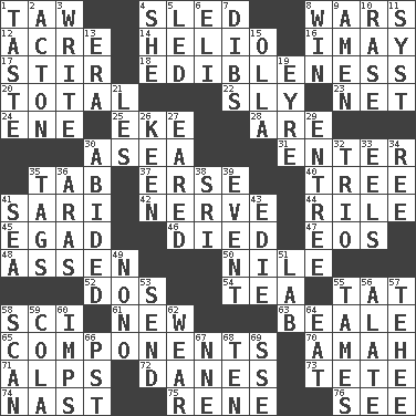 ACROSS 1. The 23rd letter of the Hebrew alphabet 4. Downhill vehicle 8. Armed conflicts 12. 1/640 square mile 14. Sun: prefix 16. "If ____ say so..." 17. Tumult 18. The property of being fit to eat 20. "_____ Recall" 22. Roguish 23. Fish or hair follower 24. Compass dir. 25. Supplement with great effort 28. "We ___ not amused" (Victoria) 30. Toward the sea 31. Keyboard key 35. Bar bill 37. Celtic language 40. Woody plant 41. Indian skirt 42. Impudent aggressiveness 44. Cause heat under the collar 45. Mild oath 46. Passed on 47. Greek goddess of the dawn 48. NE Netherlands city 50. "Death on the ____" 52. Two (Sp.) 54. Beverage made from leaves 55. Make lace 58. _-fi 61. ___ Haven, CT 63. Memphis, Tenn. Street 65. Parts 70. Wet nurse 71. High mountains 72. Natives or inhabitants of Denmark 73. False hair 74. Political cartoonist Thomas 75. French philosopher Descartes 76. Perceive with the eye DOWN 1. Clothes sense 2. 13-14th century defensive garment 3. Compose 4. A female animal or person 5. Directed 6. Connecticut Ivy Leaguer 7. Claim 8. Victory 9. So be it 10. To erase 11. System (abbr.) 13. Period 15. Water jar 19. Jane of fiction 21. French article 26. Peachy ____! 27. Having ears or earlike features 29. Main course 30. Tolerated 32. Musical group of three 33. Snakelike fish 34. To sift 35. Labels 36. Ancient river in northeast Turkey 38. _ Lanka 39. Happening 41. Ocean 43. Singer Brickell 49. Words to Nanette 51. Experiment locale 53. Transmit 55. Makes less strong or intense 56. Having winglike extensions 57. Giggle 58. Glance over 59. Root beer relative 60. Naughty children 62. Put on (as clothing) 64. Consume 66. Pacific Standard Time (abbr.) 67. Compass dir. 68. "___ Little Indians" 69. Compass dir.