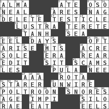 ACROSS 1. _ mater 5. Had dinner 8. Bear (Spanish) 11. Actress Patricia 12. Ancient Greek god of war 13. Tired old horse 14. Keyboard key 17. A testis 19. A period of five years 21. Cigar-shaped 22. Hyperbolic tangent 23. Ocean 24. Snakelike fish 27. 24-hour periods 29. Often (poetically) 32. Originate 34. Mountains (abbr.) 36. Land measure 37. Not divided or shared with others 38. Epoch 39. Stern 40. Prepare for publication 41. Be seated 42. Fraudulent business schemes 43. French article 44. Monetary unit of Botswana 46. Born 47. American Automobile Association (abbr.) 50. Round or rotation of duties 52. A viewer who gazes fixedly 55. Undo the wiring of 57. Characterized by complete cowardliness 59. Sounds asleep 62. Ripen 63. Body of Kaffir warriors 64. Grain storage tower 65. Actress Charlotte 66. Erode 67. Snakelike fish DOWN 1. Also 2. Area sheltered from the wind 3. Promenade 4. Native American of Southwest Alaska 5. "We ___ not amused" (Victoria) 6. Trials 7. First name in cosmetics 8. At one time in the past 9. Table seasoning 10. Double curve, resembling the letter S 12. _ moment's notice (2 wds.) 15. Sadhe (variant) 16. Inactive volcano in Sicily 18. Lyricist Gershwin 20. Poems 24. Artist's stand 25. Eat (away) 26. Ms. Damita and namesakes 28. Empty completely 29. Sea 30. Movie unit 31. Laconic 33. Arrange properly for use 35. Titan orbits this 36. Curve 42. Smooth fabric 45. Moos 47. Nonscientific branch of learning 48. Nest on high 49. Odor 51. Came up 52. Coast Guard woman 53. Ancient Roman robe 54. Toward shelter 55. Corn or form start 56. One of the Great Lakes 58. Choose 60. Pipe bend 61. Mayday