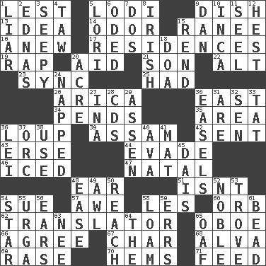 ACROSS 1. For fear that 5. Farming town in central California 9. Food container 13. The content of cognition 14. Scent 15. Indian princess (variant) 16. Afresh 17. Homes 19. Strike 20. Help 21. Male child 22. Keyboard modifier key 23. Synchronize (abbr.) 25. Possessed 26. N. Chile seaport 30. 90 degrees 34. Hangs 35. Length times width 36. Central Nebraska county 39. Indian state 42. Emitted 43. Celtic language 44. Dodge 46. On the rocks 47. Relating to or accompanying birth 48. Ewer handle 51. Is not 54. Institute legal proceedings 57. Deep reverence 58. French article 60. Globe 62. Interpreter 65. Mitch Miller's instrument 66. Match 67. Burn to charcoal 68. Inventor's middle name 69. To erase 70. Equivocates 71. Nourish DOWN 1. One who doesn't tell the truth 2. Ferber et al. 3. Not well drained, as in land 4. The 23rd letter of the Hebrew alphabet 5. Australian parrot (variant) 6. Wrote a lyric poem 7. Two (Sp.) 8. From or relating to Ireland 9. Daniel's nick name 10. South American Indian 11. Stitch closed the eyes of (a falcon) 12. Behest 15. Tear apart 18. ___ good deed 20. Land measure 24. Slept 27. _ tizzy (2 wds.) 28. Music discs 29. NE Netherlands city 30. Artist's stands 31. "We ___ not amused" (Victoria) 32. Elected rep. 33. Make lace 36. Flowery wreath 37. The grampus (Milton) 38. Purpose 40. Actress Gardner 41. Floor covering 45. Raised platform 48. Comfort 49. Leather borer 50. Arrive at 52. Having high moral qualities 53. Collection of objects 54. Play the lead 55. Capital and largest city of Mongolia 56. Hearing organs 58. Rich soil 59. Blunders 61. Necklace unit 63. Born 64. Definite Article 65. Clumsy lout