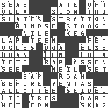 ACROSS 1. Oceans 5. Had dinner 8. Often (poetically) 11. Rounded earthenware pot or jar 12. The Jewish people; Israel 13. Three (prefix) 14. Chalkboards 17. Ski resort town in Vermont 19. Full of chinks, cracks, or crevices 21. Moe Howard, for one 22. Mediterranean tributary 23. Cask 24. Pet locale 27. Adolescent 29. Opposite of masc. 32. Stares at amorously 34. ___ good deed 36. Otherwise 37. Mouths or openings 38. Shade tree 39. Globular water bottle used in Asia 40. Wig 41. Hit sharply and swiftly 42. NE Netherlands city 43. Perceive with the eye 44. Famous astronaut Armstrong 46. Put into a specified state 47. Plant excrement 50. Wander aimlessly 52. Prior to 55. Gossips 57. One to whom something is allotted 59. A glass for beer 62. Cards in a Roman deck? 63. Angers 64. Have the gumption 65. Was introduced to 66. Age 67. Heroin DOWN 1. Distress signal 2. Pipe bend 3. Having or resembling wings 4. Smooth fabric 5. Small island 6. Cod relative 7. Related on the mother's side 8. Von Bismarck 9. Tree-dwelling hopper 10. Prong on a fork 12. Compass dir. 15. Sends forth 16. Flatfish 18. Coat; cloak 20. Sowing specialist 24. Plunders 25. Match 26. Food holder 28. Pitcher Ryan 29. Soft thread for cleaning between teeth 30. First name in cosmetics 31. Intended 33. Compass dir. 35. Electrical Unit 36. Raised railways 42. Having winglike extensions 45. Charged atoms 47. "Barney Miller" actor Jack 48. Nick name for Arthur 49. Stone: prefix 51. Women servants 52. Lip ointment 53. Writer Wiesel 54. Sudden quick movement 55. Affirmative reply 56. Neighbor of Neb. 58. Car or cant ending 60. Epoch 61. Part of a journey