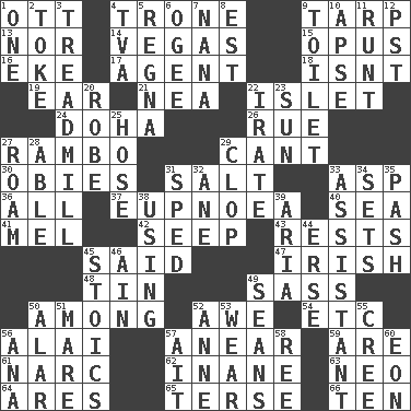 ACROSS 1. Baseball player Mel 4. Marketplace scale 9. Canvas cover 13. Not either 14. Viva Las _ 15. Musical composition 16. Make supply last 17. Rep 18. Is not 19. Ewer handle 21. Teachers' org. 22. Small island 24. Capital of the state of Qatar 26. Regret 27. Role for Stallone 29. Patter 30. Off-Broadway awards 31. Table seasoning 33. Viper 36. 100% 37. Normal relaxed breathing 40. Ocean 41. Cartoonist voice _ Blanc 42. Ooze 43. Musical pauses 45. Stated 47. From or relating to Ireland 48. Shallow baking pan 49. Backtalk 50. Amid 52. Deep reverence 54. And so on (abbr.) 56. Mountain range southwest of Kyrgyzstan 57. Approach 59. "We ___ not amused" (Victoria) 61. Drug cop 62. Silly 63. Modern: prefix 64. Ancient Greek god of war 65. Laconic 66. Nine, plus one DOWN 1. Single 2. Puff or smoke 3. Excercise machine 4. Federal power corp. 5. Canadian anthropologist Darnell 6. Double curve, resembling the letter S 7. Grandmother 8. Eastern Standard Time (abbr.) 9. Bathroom plumbing fixture 10. Domed church section 11. The smallest animal of a litter 12. Pacific Standard Time (abbr.) 20. Loose flowing garment 22. Feeling or showing extreme anger 23. Player for Phoenix 25. Flexible conduit 27. Wander 28. Competent 29. Hoof sound 31. Hurried 32. A saturated hydrocarbon 33. Aide 34. Puts into a specified state 35. Romantic infatuation 38. Exploiting 39. Operatic vocal solo 44. Celtic language 45. Unemotional ones 46. The 18th letter of the Arabic alphabet 49. Seines 50. Having or resembling wings 51. Female horse 52. Queen of England 1702-14 53. Erode 55. Algonquian 56. Santa ___, CA 57. Small island 58. To sift 60. Period of immesurable duration