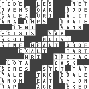 ACROSS 1. Periodic rise and fall of the sea level 5. French article 8. Fish or hair follower 11. Baking chambers 13. Boat paddle 14. Method 15. An organ shaped like a helmet 16. RI univ. 17. Set down 18. Santa ___, CA 19. Naughty children 21. A salt of uric acid 22. Portable shelter 24. Without 25. Is extant 27. Plant excrement 29. Native of Scotland 30. Wet 32. Trig term 33. Intended 35. Mitch Miller's instrument 39. Glorify 41. Small pie 42. Medical imaging device (abbr.) 43. Medicinal drug used to evoke vomiting 45. Globular water bottle used in Asia 48. Keg 49. Titles for men of rank and authority 50. Proofreading order 52. Make lace 55. Light colored 56. Ring climax 57. Peak District village in England 59. At once, immediately (arch.) 60. Erode 61. Thermoplastic polyamide 62. Strike 63. Personal question 64. Made supply last DOWN 1. Ancient Roman robe 2. "Terrible" tsar 3. Conveyance 4. Compass dir. 5. Central Nebraska county 6. Hearing organs 7. Indian title of respect (Mr.) 8. Pitcher Ryan 9. Prepares for publication 10. Wig 12. Inhabitant of Heaven 14. Hindu Mythology: god of death 20. Mountains (abbr.) 21. United States Postal Service (abbr.) 23. First name in cosmetics 25. Curvy letter 26. One more than ninety 27. Male child 28. Small island 30. Floor protector 31. Hauls 33. Impair 34. Connecticut Ivy Leaguer 36. Sass 37. Mouth or opening 38. And so on (abbr.) 40. Dec. holiday 43. Frozen water 44. Eucharist need 45. Woody, climbing, usually tropical plant 46. Lowest deck of a ship 47. Adolescent 49. Practice fight 50. Heroin 51. Carry 53. Medicinal plant 54. Look after 56. Afternoon social gathering 58. Color