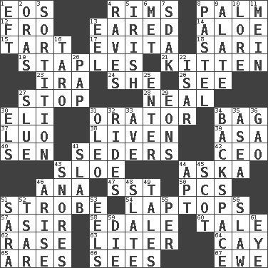 ACROSS 1. Greek goddess of the dawn 4. Basketball hoops 8. Inside of hand 12. Away 13. Having ears or earlike features 14. _ vera 15. Small pie 17. Webber/Rice musical 18. Indian skirt 19. Paper fasteners 21. Baby cat 23. Lyricist Gershwin 24. A female animal or person 26. Observe 27. Cease 28. Anneal 30. Biblical high priest 31. Speaker 34. Paper or plastic container 37. Nilotic language 38. Make or become more lively 39. White ___ sheet 40. Elected rep. 41. Spring feasts 42. Corporate head (abbr.) 43. _ gin 44. "____ silly question..." 46. Santa ___, CA 47. Fast jet (abbr.) 50. Personal Computers (abbr.) 51. Disco prop 54. Portable computers 57. SW Saudi Arabia district 58. Peak District village in England 60. Story 62. Raze (variant) 63. 61 cubic inches 64. Island 65. Ancient Greek god of war 66. Perceives with the eye 67. She-sheep DOWN 1. Newt 2. Mouths or openings 3. Determination 4. All-night dance parties 5. From or relating to Ireland 6. Was introduced to 7. Neighbor of Neb. 8. Soft color 9. Having winglike extensions 10. Old wives' tales, e.g. 11. Count _ (2 wds.) 13. Snakelike fish 16. Edible starchy tuberous root 20. Infant food 22. Austrian river, tributary to the Danube 25. Keyboard key 27. Turn sharply 29. Immeasurably long periods of time 30. Raised railways 31. Margarine 32. Amusement-park features 33. "___ Maria" 34. Keyboard key 35. Toward the sea 36. E Mali city 41. Broad, flat, thick piece 43. Sounds asleep 44. Fitting 45. Highlander 46. Ascend 48. Chalkboard 49. Falsehoods 51. "Two Mules for Sister ____" 52. Russian ruler of old 53. Snakelike fish 55. For each 56. Cole _ (cabbage dish) 59. Expire 61. Sight organ