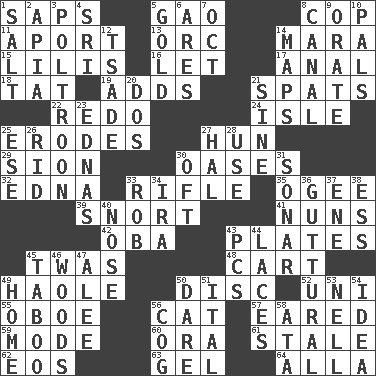 ACROSS 1. Plant excrements 5. E Mali city 8. Police officer (slang) 11. To the left, to Queeg 13. The grampus (Milton) 14. Hindu Mythology: god of death 15. Ms. Damita and namesakes 16. Allow 17. Of or related to the anus 18. Make lace 19. Sums up 21. Arguments over trivial matters 22. Do over again 24. Capri or Wight 25. Eats (away) 27. Attila the _ 29. The Jewish people; Israel 30. Fertile tracts in a desert 32. Pulitzer Prize-winning author Ferber 33. Firearm 35. Double curve, resembling the letter S 39. Derisive sound 41. Religious women 42. Chief or king in Benin or Nigeria 43. Food holders 45. It was, poetically 48. Heavy open wagon 49. White Person, in Hawaii 50. Flat circle 52. Corn or form start 55. Mitch Miller's instrument 56. Feline 57. Having ears or earlike features 59. Method 60. Mouth or opening 61. Lacking originality or spontaneity 62. Greek goddess of the dawn 63. Set 64. Silent film actress Nazimova DOWN 1. Table seasoning 2. Capital of Western Samoa 3. Coward 4. Indian title of respect (Mr.) 5. Gilt 6. Ancient Greek god of war 7. Sep. follower 8. Lessep's creation 9. Speak pompously 10. Friends 12. Sadhe (variant) 14. Atlas contents 20. Two (Sp.) 21. Trig term 23. Ferber et al. 25. Compass dir. 26. To free from 27. Actor Linden 28. Purpose 30. Often (poetically) 31. Echolocation 33. Director Reiner 34. Retirement account (abbr.) 36. From the throat 37. Compass dir. 38. Double-curved letter 40. Olfactory organ 43. Personal Computers (abbr.) 44. Shoestrings 45. Off limits 46. Forest 47. Toward shelter 49. Dwelling 50. Have the gumption 51. Slanted text style (abbr.) 53. 1994 drama film starring Jodie Foster 54. The main thing one is thinking about 56. Gear tooth 58. "One Day ___ Time"