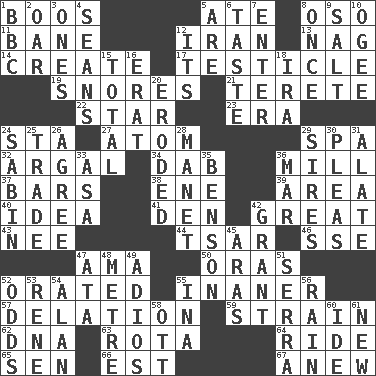 ACROSS 1. Scornful sounds 5. Had dinner 8. Bear (Spanish) 11. Object of repulsion 12. SW Asia republic 13. Tired old horse 14. Make 17. A testis 19. Sounds asleep 21. Cigar-shaped 22. Play the lead 23. Epoch 24. R.R. building 27. Tiny particle 29. Health resort 32. Therefore, facetiously 34. Pat or tap gently 36. Place where flour is made 37. Soap units 38. Compass dir. 39. Type of rug 40. The content of cognition 41. Lair 42. Relatively large 43. Born 44. Russian ruler of old 46. Compass dir. 47. Nanny (var.) 50. Mouths or openings 52. Declaimed 55. More lacking in sense or substance 57. Conveyance 59. Put through a sieve 62. Heredity factor (abbr.) 63. Roll call or roster of names 64. Travel on or in a vehicle 65. Elected rep. 66. Eastern Standard Time (abbr.) 67. Afresh DOWN 1. English channel? 2. Rowing implement 3. Singles 4. Actors Connery and Penn 5. "We ___ not amused" (Victoria) 6. Clothes sense 7. Keyboard key 8. At one time in the past 9. Table seasoning 10. Double curve, resembling the letter S 12. ___ a Wonderful Life 15. "_____ Recall" 16. Part of Q.E.F. 18. Lyricist Gershwin 20. Worn away 24. Unit of acoustic absorption 25. Swap 26. Match 28. French painter Edouard 29. Male parents of animals 30. Entreaties 31. Having winglike extensions 33. White ___ sheet 35. Gillaume's butler role 36. Impair 42. Let have 45. Caspian sea tributary 47. _ moment's notice (2 wds.) 48. Distance measurement (Brit.) 49. Goodbye (Sp.) 51. Father Junipero _ 52. Likelihood 53. French philosopher Descartes 54. ____ Jay Lerner 55. _ tizzy (2 wds.) 56. Water falling in drops from the sky 58. Baseball player Mel 60. Binary compound 61. ___ Haven, CT