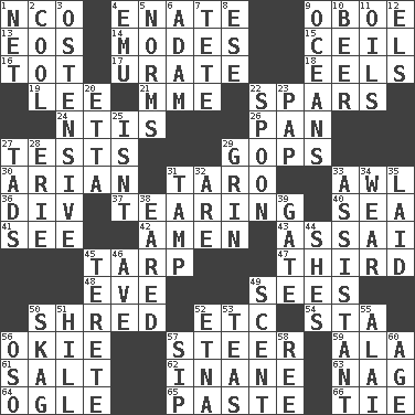 ACROSS 1. Non-commissioned officer (abbr.) 4. Related on the mother's side 9. Mitch Miller's instrument 13. Greek goddess of the dawn 14. Methods 15. To provide with a ceiling 16. Small child 17. A salt of uric acid 18. Snakelike fish 19. Area sheltered from the wind 21. Madame (abbr.) 22. Practice fights 24. Nuclear Threat Initiatives 26. Baking dish 27. Trials 29. Republicans 30. Believer in; advocate of (suffix) 31. Pacific island yam 33. Leather borer 36. HTML Container Element 37. Pulling apart 40. Ocean 41. Observe 42. So be it 43. Slender Brazilian palm 45. Canvas cover 47. One of three equal parts 48. First lady 49. Perceives with the eye 50. Tear up 52. And so on (abbr.) 54. R.R. building 56. Migrant worker of the '30s 57. Bull 59. Insect wing 61. Table seasoning 62. Silly 63. Tired old horse 64. Stare 65. Thick mixture 66. Neckwear DOWN 1. Fish or hair follower 2. Calm and collected 3. Clearly or manifestly demonstrative 4. Australian flightless bird 5. Typical standards 6. First man 7. False hair 8. Compass dir. 9. Seas 10. Fermented drink made from hops 11. Petroleums 12. Raised railways 20. Singer James 22. Soup utensil 23. Infant food 25. Is not 27. Small amounts or degrees 28. One of the Great Lakes 29. Smile widely 31. Pack (down) 32. "We ___ not amused" (Victoria) 33. Aide 34. Erode 35. Put down 38. Having ears or earlike features 39. Yard entry 44. "______ My Girl" (Turtles hit) 45. Cigar-shaped 46. "___ Maria" 49. Aroma 50. Heroin 51. Land elevation 52. Inactive volcano in Sicily 53. Beverages made from leaves 55. Jai ____ 56. Bear (Spanish) 57. Small drink 58. To sift 60. Personal question