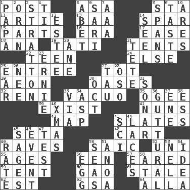 ACROSS 1. Mail 5. White ___ sheet 8. R.R. building 11. Nick name for Arthur 13. Sound made by sheep 14. Practice fight 15. Components 16. Period 17. Relaxation 18. Santa ___, CA 19. Jacques of French films 21. Portable shelters 22. Adolescent 24. Otherwise 25. Main course 27. Small child 29. Period of immesurable duration 30. Fertile tracts in a desert 32. Painter Guido (1575-1642) 33. In a vacuum (with "in") 35. Double curve, resembling the letter S 39. Be 41. Religious women 42. Atlas unit 43. Chalkboards 45. Stalk of a moss capsule 48. Heavy open wagon 49. All-night dance parties 50. Ketch in the Levant 52. Corn or form start 55. Eons 56. Car or cant ending 57. Having ears or earlike features 59. Portable shelter 60. E Mali city 61. Lacking originality or spontaneity 62. Eastern Standard Time (abbr.) 63. Girls' org. (abbr.) 64. Silent film actress Nazimova DOWN 1. Dad 2. Northwest Algerian city 3. Ski resort town in Vermont 4. Teat (slang) 5. Collude with 6. Indian skirt 7. Auto club (abbr.) 8. Connects, as a bridge 9. Clothes sense 10. Ancient Greek god of war 12. First name in cosmetics 14. Sew up the eyelids of hawks and falcons 20. One (Scot) 21. Wig 23. Bert's buddy 25. Hearing organ 26. Born 27. The 19th letter of the Greek alphabet 28. Bear (Spanish) 30. Sep. follower 31. Echolocation 33. By way of 34. Viper 36. From the throat 37. Compass dir. 38. Curvy letter 40. Dec. holiday 43. _-fi 44. Shoestrings 45. Gurus 46. Happening 47. Trial 49. Assign a rank or rating to 50. Oceans 51. Small Philippine buffalo 53. 1994 drama film starring Jodie Foster 54. It may be bright or harebrained 56. Ovum 58. "One Day ___ Time"