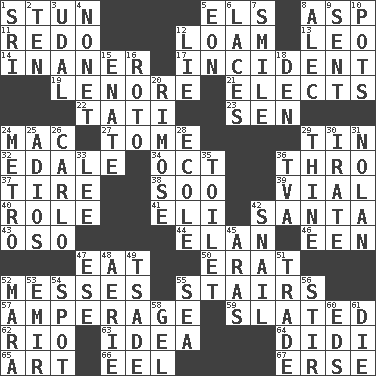ACROSS 1. Surprise greatly 5. Raised railways 8. Cleo's killer 11. Make new 12. Rich soil 13. Lion 14. More empty; more void 17. Happening 19. Poe poem 21. Opts 22. Jacques of French films 23. Elected rep. 24. Big _ 27. Heavy book 29. Shallow baking pan 32. Peak District village in England 34. Sep. follower 36. Through, poetically 37. Become fatigued 38. "Barney Miller" actor Jack 39. Small bottle 40. Hero or heavy, e.g. 41. Biblical high priest 42. Before Barbara or Clara 43. Bear (Spanish) 44. Enthusiasm 46. Car or cant ending 47. Erode 50. Part of Q.E.F. 52. Makes clutter 55. Flight of steps 57. Electrical Measurement 59. Scheduled 62. _ de Janeiro 63. The main thing one is thinking about 64. "You Light Up My Life" star Conn 65. Nonscientific branch of learning 66. Snakelike fish 67. Celtic language DOWN 1. _ Lanka 2. Nine, plus one 3. Freehold land 4. Music written for nine 5. Age 6. Shoestrings 7. Grin 8. Actor Baldwin 9. Transmitted 10. Plant holders 12. Untruth 15. Maternal 16. Printing process, for short 18. Lair 20. Full of chinks, cracks, or crevices 24. Paris' subway 25. Goodbye (Sp.) 26. Monte _, Las Vegas Hotel/Casino 28. Learning spot: Fr. 29. One or ones belonging to thee 30. Feeling or showing extreme anger 31. Pitcher Ryan 33. Area sheltered from the wind 35. Bathroom plumbing fixture 36. Federal power corp. 42. Slow-paced one 45. Ancient river in northeast Turkey 47. Compass dir. 48. Nest on high 49. Sadhe (variant) 51. Barter 52. Hindu Mythology: god of death 53. Arab leader 54. Blemish 55. Ocean 56. Agitate 58. Set 60. Begley and Asner 61. Pass on