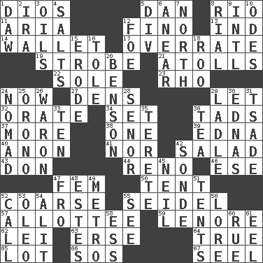 ACROSS 1. "Vaya con ____" 5. Daniel's nick name 8. _ de Janeiro 11. Operatic vocal solo 12. A pale, very dry sherry 13. Working for oneself (abbr.) 14. Place for singles 17. Make much ado about nothing 19. Disco prop 21. Ringlike coral islands and reefs 22. Flatfish 23. 17th letter of the Greek alphabet 24. Immediately 27. Hiding places for outlaws 29. Allow 32. Speak pompously 34. Put into a specified state 36. Small boys 37. Greater amount 38. Single 39. Pulitzer Prize-winning author Ferber 40. At once, immediately (arch.) 41. Not either 42. First course 43. Spanish title 44. Former U.S. Attorney General Janet 46. Compass dir. 47. Opposite of masc. 50. Portable shelter 52. Unrefined 55. A glass for beer 57. One to whom something is allotted 59. Poe poem 62. Flowery wreath 63. Celtic language 64. Loyal 65. Car dealer's back yard 66. Distress signal 67. Stitch closed the eyes of (a falcon) DOWN 1. Fool 2. Retirement account (abbr.) 3. Lubricates 4. Table seasonings 5. HTML Container Element 6. Approach 7. Compass direction 8. Monetary unit of Yemen 9. International (abbr.) 10. Lyric poems 12. Enemy 15. Eat (away) 16. Lacquered or enameled metalware 18. Friend of Pooh 20. Gillaume's butler role 24. Wanderer 25. U. of Maine site 26. Make _____ (do battle with) 28. Sir (Sp.) 29. Dipping utensil 30. Ferber et al. 31. Sadhe (variant) 33. "___ Little Indians" 35. Cigar-shaped 36. Beverage made from leaves 42. Something which is sent 45. Famous astronaut Armstrong 47. Back 48. _____ Park, CO 49. Paris' subway 51. Portable shelters 52. Give a ring to 53. Butter sub 54. Came down and settled, as after flight 55. Observe 56. Old wives' tales, e.g. 58. Curvy letter 60. Regret 61. Snakelike fish