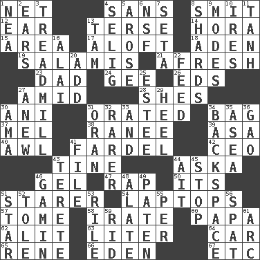 ACROSS 1. Fish or hair follower 4. Without 8. Stricken, poetically 12. Ewer handle 13. Laconic 14. Israeli folk dance 15. Type of rug 17. High up in or into the air 18. An important port of Yemen 19. Deli grouping 21. Anew 23. June honoree 24. Turn to the right 26. Begley and Asner 27. Among 28. "______ My Girl" (Turtles hit) 30. Black tropical American cuckoo 31. Declaimed 34. Container for groceries 37. Cartoonist voice _ Blanc 38. Indian princess (variant) 39. White ___ sheet 40. Leather borer 41. Bundle 42. Corporate head (abbr.) 43. Prong on a fork 44. "____ silly question..." 46. Set 47. Strike 50. ___ a Wonderful Life 51. A viewer who gazes fixedly 54. Portable computers 57. Heavy book 58. Feeling or showing extreme anger 60. Dad 62. Came down and settled, as after flight 63. 61 cubic inches 64. Auto 65. French philosopher Descartes 66. Locale of original sin 67. And so on (abbr.) DOWN 1. Teachers' org. 2. Hearing organs 3. Excercise machine 4. Former Milwaukee Brewers owner Bud 5. Came up 6. Overdraft (abbr.) 7. Bristle 8. Broken pieces 9. Methods 10. Angers 11. Hyperbolic tangent 13. Scottish cap 16. Mountain range southwest of Kyrgyzstan 20. Say or write further 22. Nourish 25. First name in cosmetics 27. Afresh 29. The bottom of a shoe or boot 30. Wet nurse (var.) 31. Northwest Algerian city 32. More valued for its uncommonness 33. Plus 34. Keyboard key 35. At sea 36. E Mali city 41. Do some clerical work 43. Cigar-shaped 44. Small island 45. Cease 46. Homeless child 48. Having winglike extensions 49. Eucharist need 51. Play the lead 52. Lacquered or enameled metalware 53. Cause heat under the collar 55. For each 56. Argument over a trivial matter 59. To free from 61. Curve